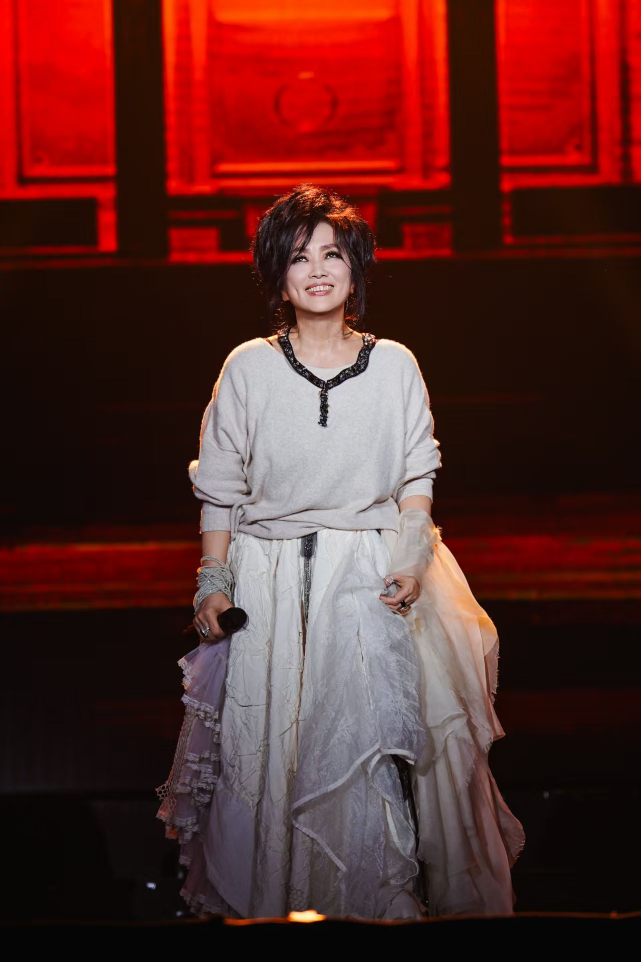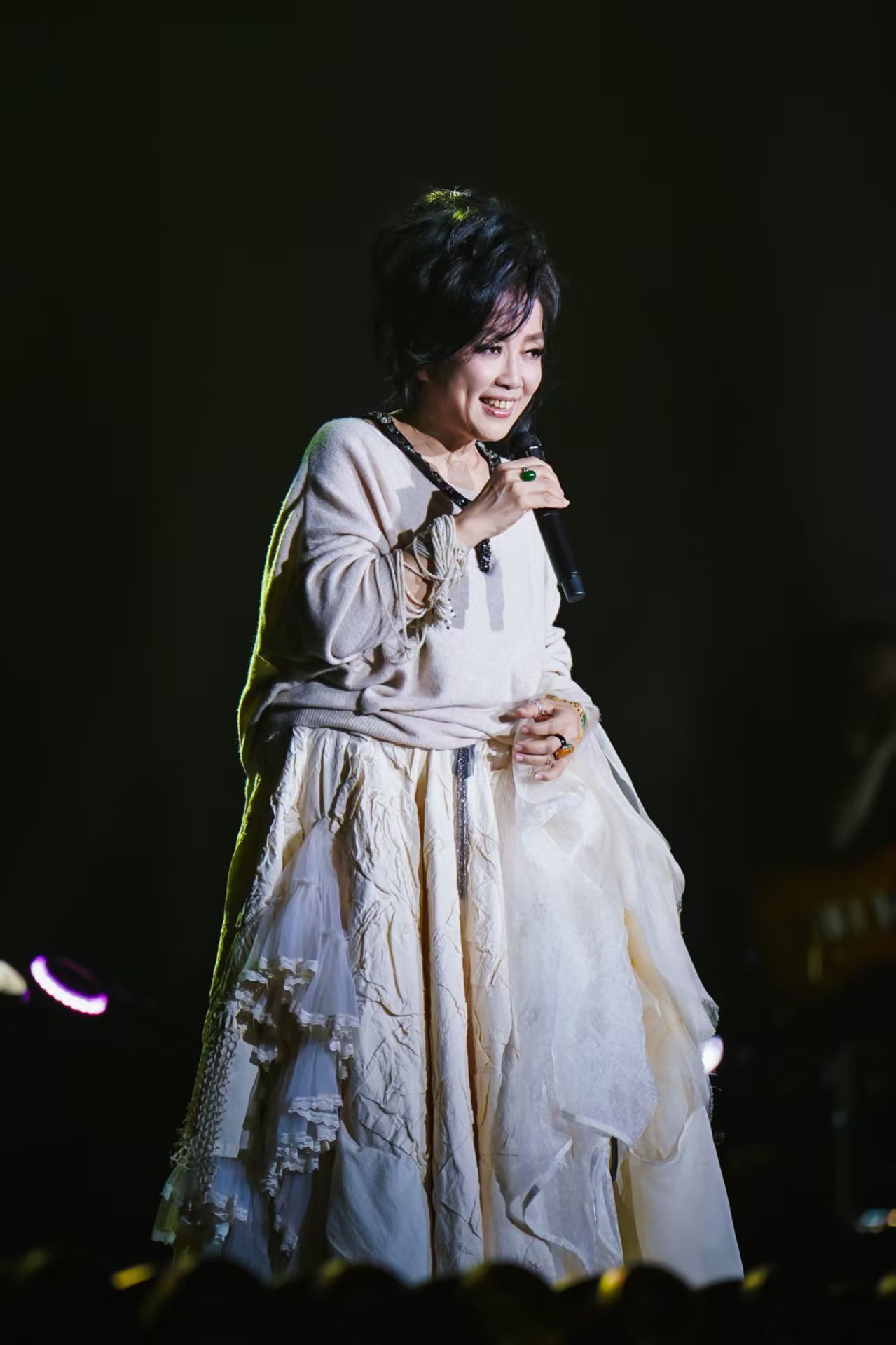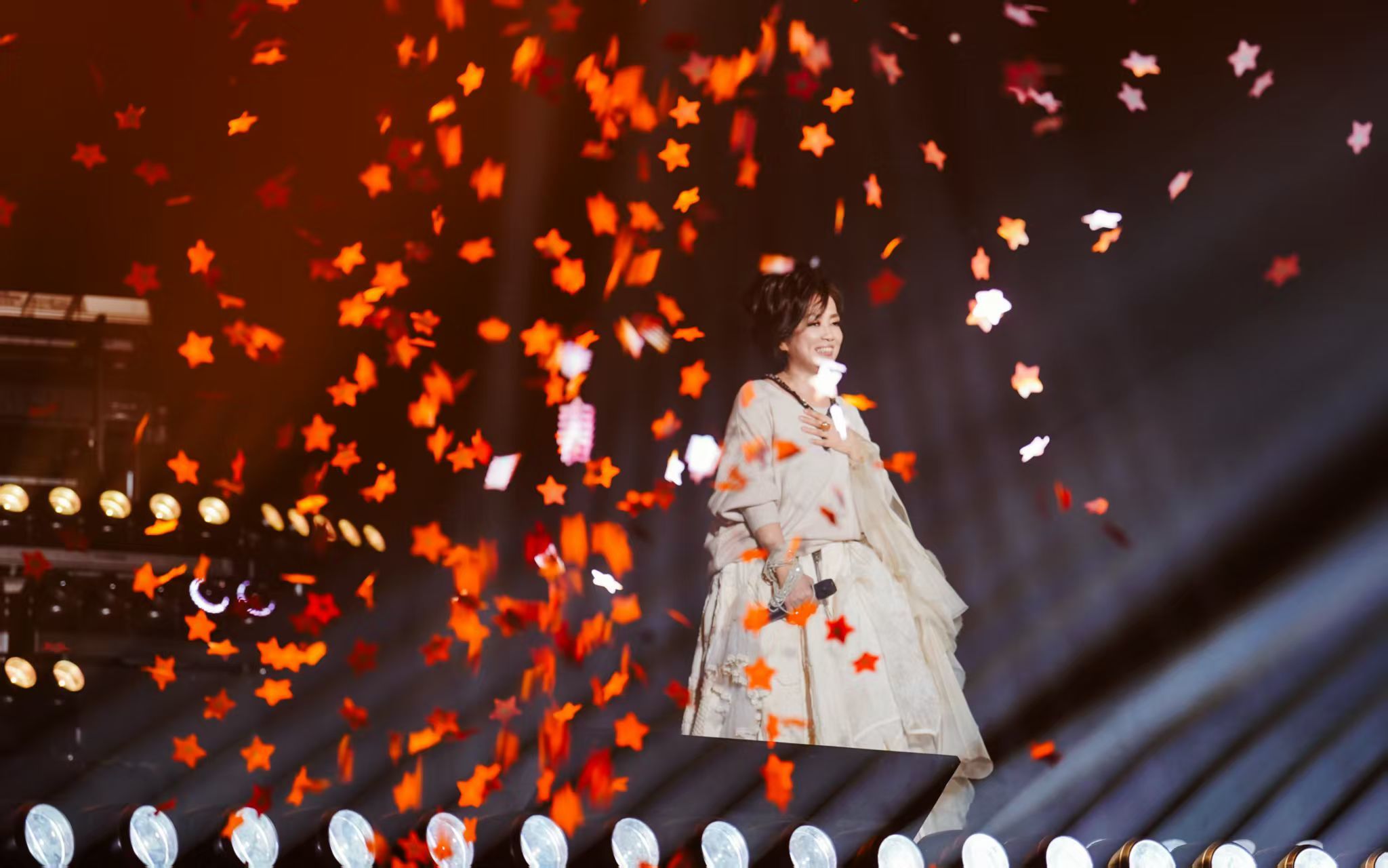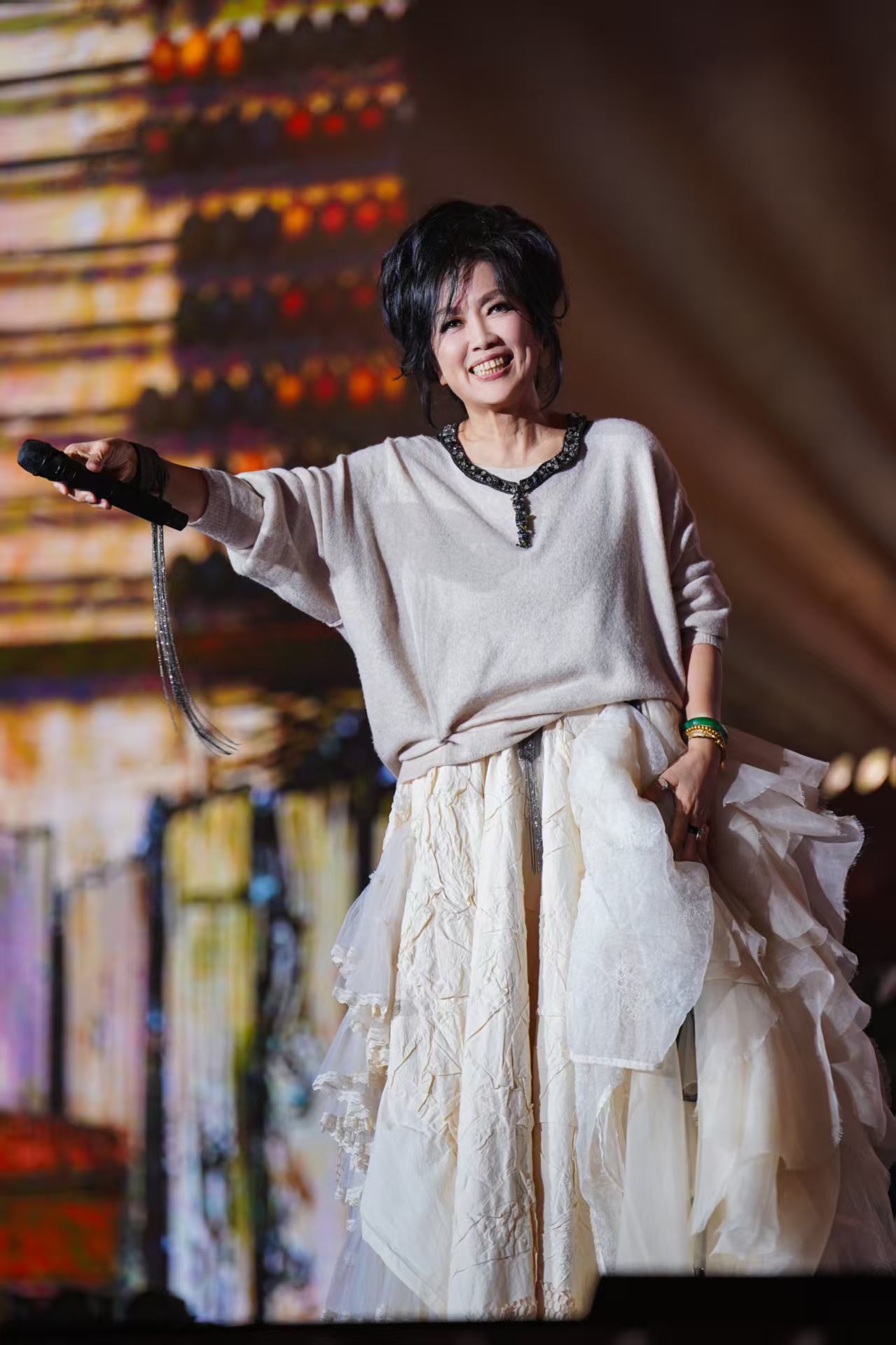 歌单编排上,2.0版本在1.0基础上实现全新升级,既保留了齐豫的经典代表作,更暗藏诸多惊喜彩蛋,其中最让厦门歌迷倍感亲切的,便是她特意准备的闽南语经典《爱拼才会赢》。当熟悉的前奏轻轻响起,全场瞬间沸腾,欢呼声、掌声交织成一片海洋。不同于原版的激昂奋进,齐豫用自己温润而富有感染力的嗓音,将这首闽南语金曲演绎出别样的柔情与力量,一字一句皆是诚意,一唱一和尽是宠溺。这波“在地化”宠粉操作,让现场歌迷直呼“太懂我们了”“这波真的赢麻了”,瞬间拉近了与这座城市的距离。除了闽南语彩蛋,本场演出还有一个意外之喜——齐豫为厦门歌迷带来了《Five Hundred Miles》的巡演首唱。这首风靡全球的经典民谣,在齐豫的演绎下,褪去了原版的沧桑,多了几分东方式的温柔与乡愁。