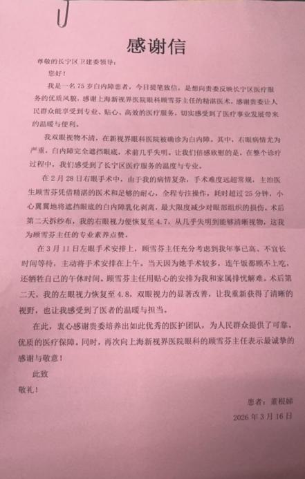 “从几乎失明到能清晰视物,顾院长的专业素养让我由衷点赞;她贴心的安排,更让我们感受到了医者的温暖与担当。”近日,75岁的董阿姨将一封感谢信送到上海市长宁区卫健委,同时为光正新视界眼科集团旗下上海新视界眼科医院及白内障专科顾雪芬院长送上了锦旗与真挚的谢意。字里行间,流淌着一位长者重见光明后的满心欢喜。