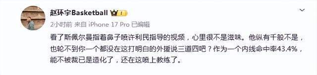 媒体人赵环宇对此发表尖锐评论,直指斯佩尔曼“配不上如此态度”:“他一个内线命中率仅43.4%、表现远未达预期的外援,能在CBA留队已是侥幸,竟敢对一位为中国女篮重振雄风立下汗马功劳的功勋教练指手画脚?”他强调,许利民曾带领中国女篮从奥运会历史最差战绩中突围,奠定世界杯亚军基石,是实至名归的中国篮球名人堂级人物。而斯佩尔曼此前在韩国联赛辗转,如今却以“被雇佣者”身份对本土功勋教练施压,令人心寒。