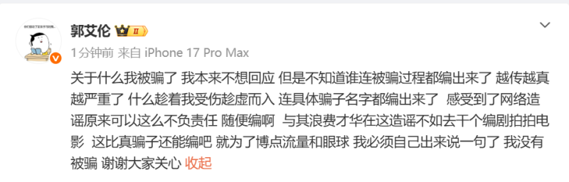 关于什么我被骗了,我本来不想回应,但是不知道谁连被骗过程都编出来了,越传越真越严重了,什么趁着我受伤趁虚而入,连具体骗子名字都编出来了,感受到了网络造谣原来可以这么不负责任,随便编啊,与其浪费才华在这造谣不如去干个编剧拍拍电影,这比真骗子还能编吧,就为了博点流量和眼球。