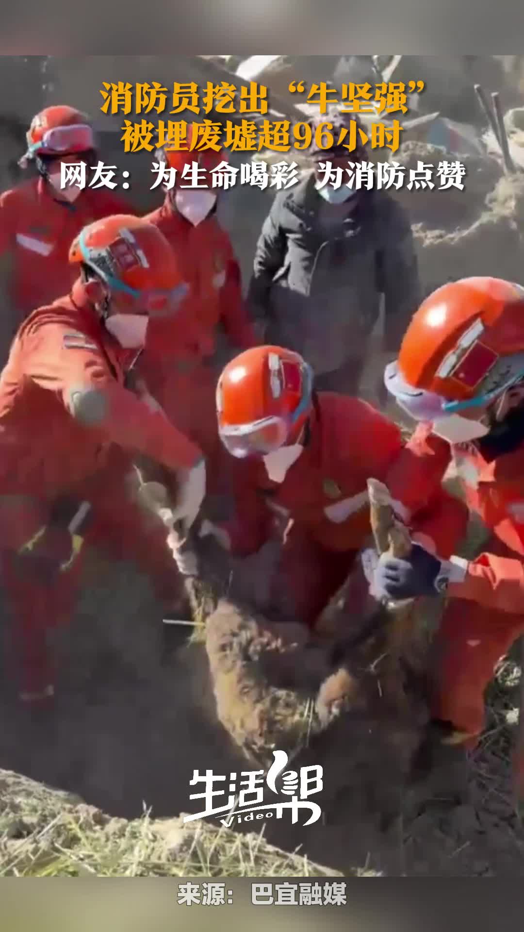 消防员挖出“牛坚强” 震后被埋废墟超96小时