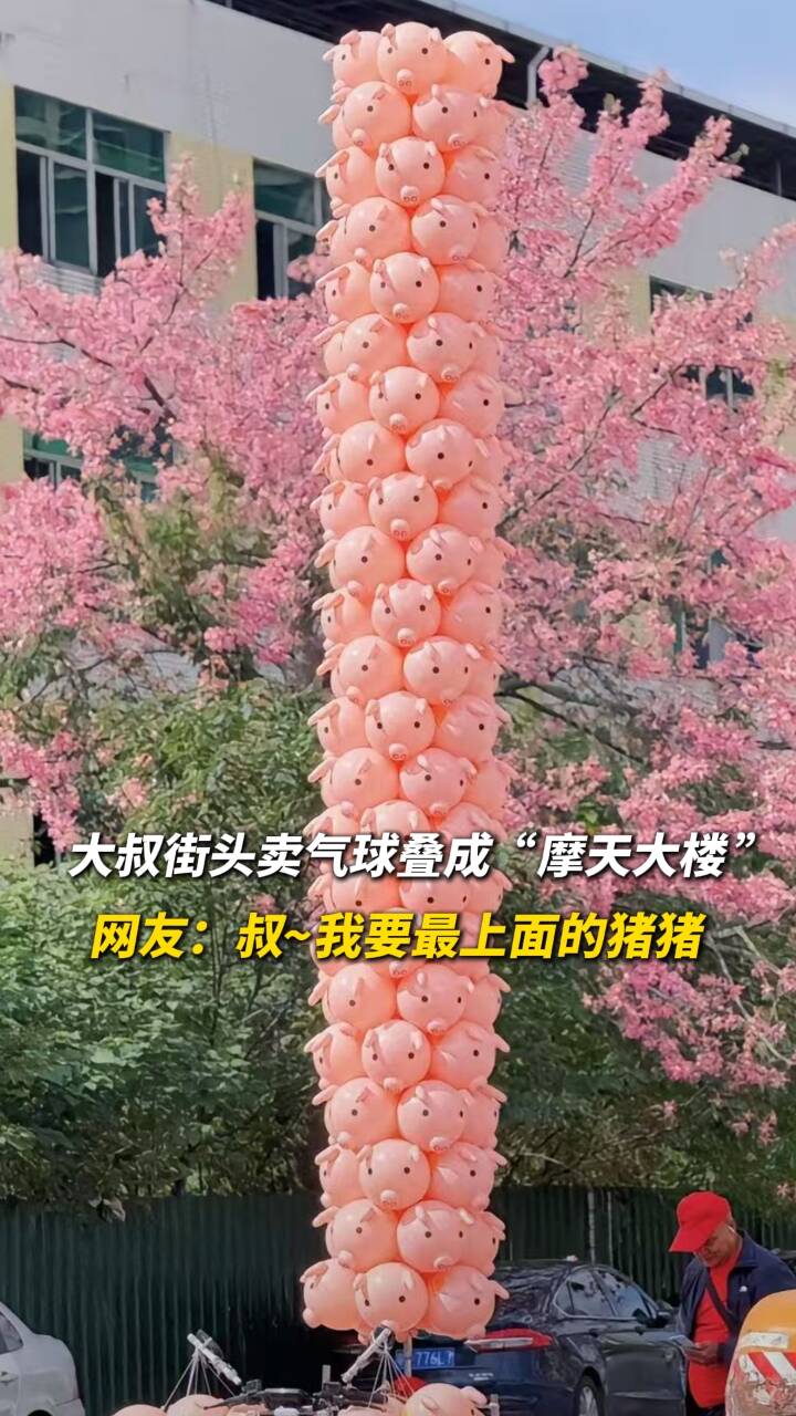大叔街头卖气球叠成“摩天大楼 ” 网友:叔~我要最上面的猪猪!