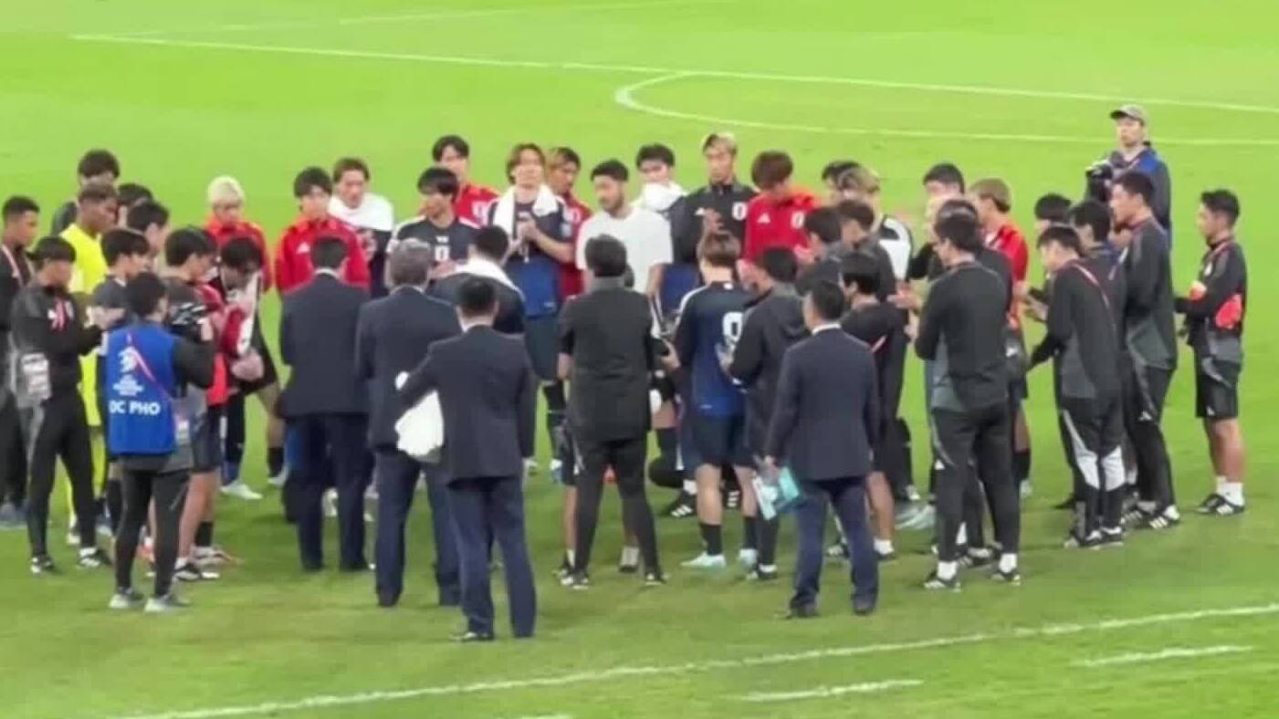 国足1-3日本,日本队赛后围成一圈总结比赛,未上场球员加练