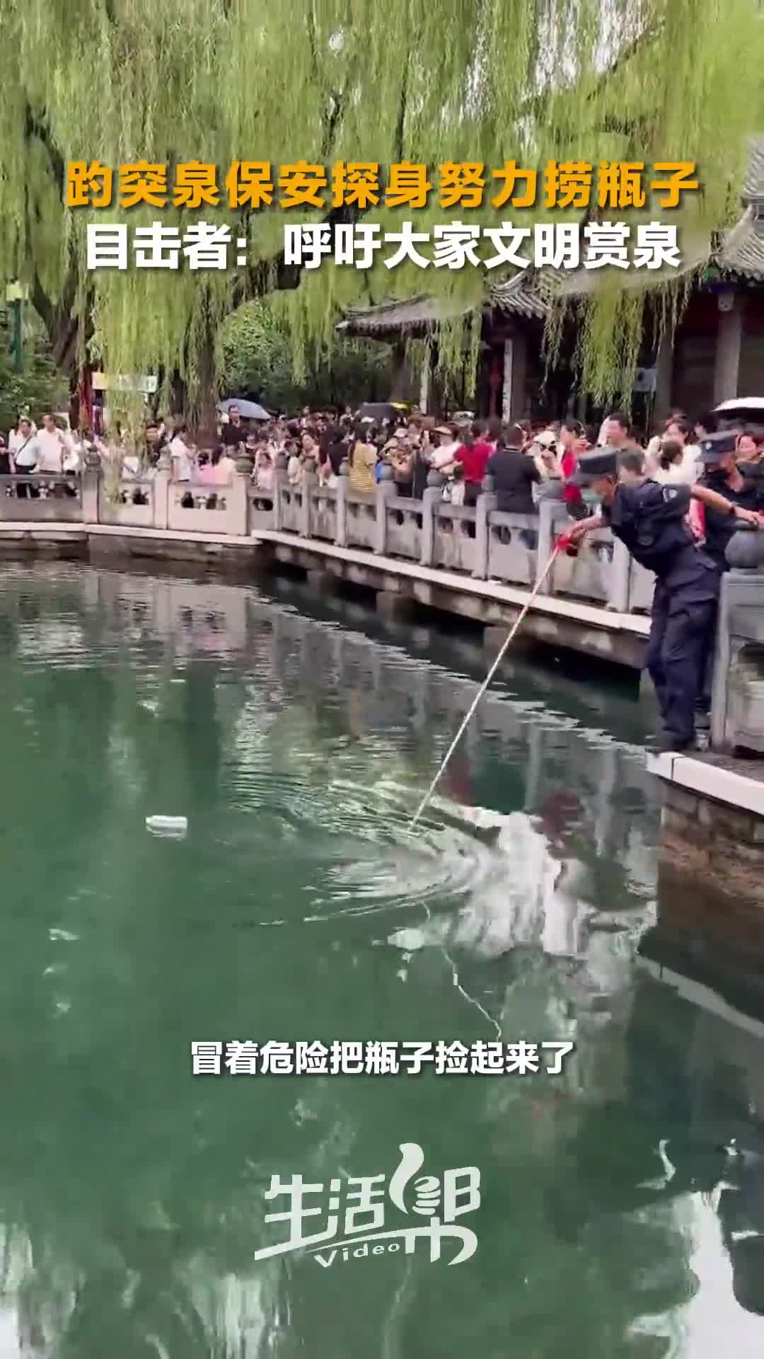 趵突泉保安探身努力捞瓶子 目击者:呼吁大家文明赏泉