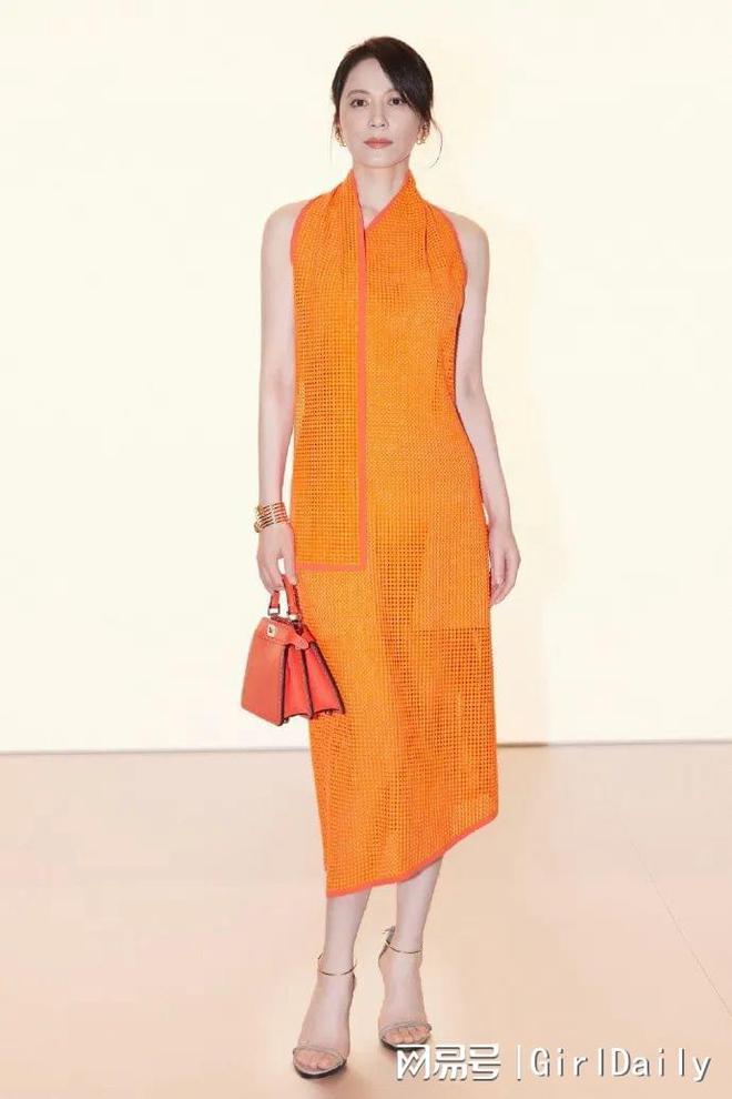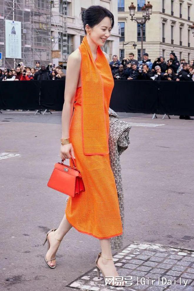 谁不懂这种美啊,肌肤胜雪,骨相一绝,气质凌冽淡然,一抹橙色挂脖连身裙,有种不顾秀场其他人死活的美。