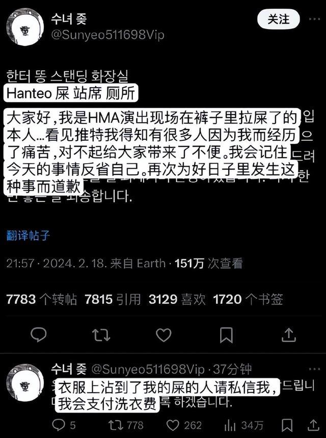 不仅承认了拉屎行为,还对受影响的大家表示抱歉,衣服被沾到的人可以赔偿洗衣费。