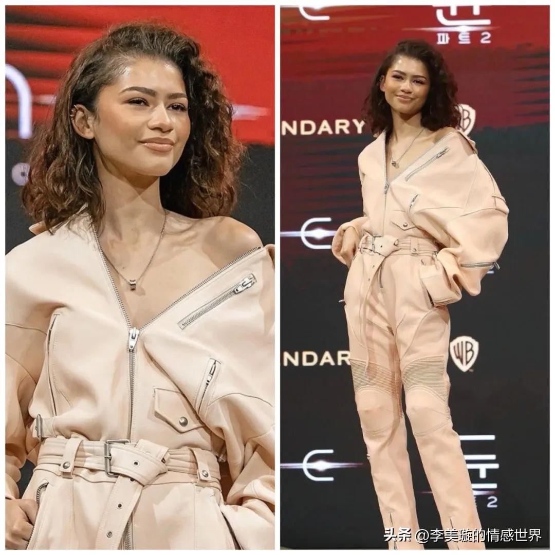 在韩国首尔宣传《沙丘2》时,赞达亚的这套裤装来自韩国设计师,英气逼人,也很适合她的身材。