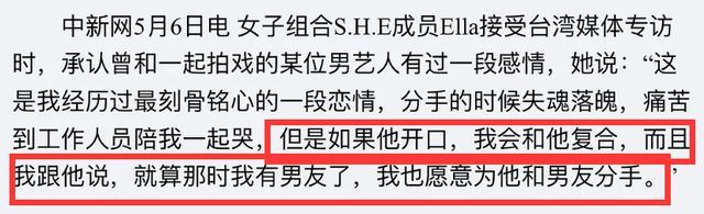Ella曾自曝和某位男艺人有过一段感情,分手后十分痛苦。还表示:如果她开口,我会和他复合;就算那时我有男友了,我也愿因为他和男友分手。