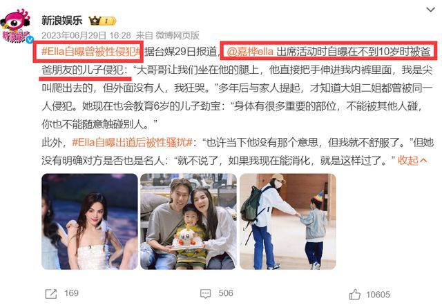 这次Ella在家裸体运动被儿子劝说,让Ella过往的大胆行为被扒出,再次掀起热,很多人都觉得她举止辣眼,过于大胆。值得一说的是,去年6月,Ella自曝不到10岁时被爸爸朋友的儿子侵犯。她现在也会教育儿子劲宝:“身体有很多重要的部位,不能被其他人碰,你也不能随意触碰别人。”