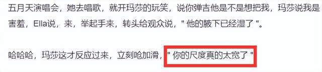 Ella也曾多次在公开场合说一些大胆的话,比如去彭佳慧演唱会当嘉宾,上台就说彭佳慧的糗事,一度让彭佳慧尴尬的阻止;在五月天演唱会上,Ella的大尺度发言也让玛莎无语感慨:你的尺度真的太宽了。