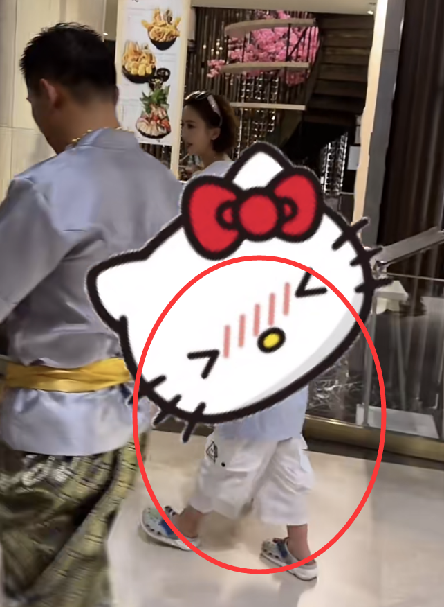 儿子朵朵紧跟在妈妈身边,虽然正脸被遮挡住,但是能看到朵朵长得比较胖呼,穿着蓝色上衣搭配白色九分裤,脚上穿着一双拖鞋,看上去十分舒适。