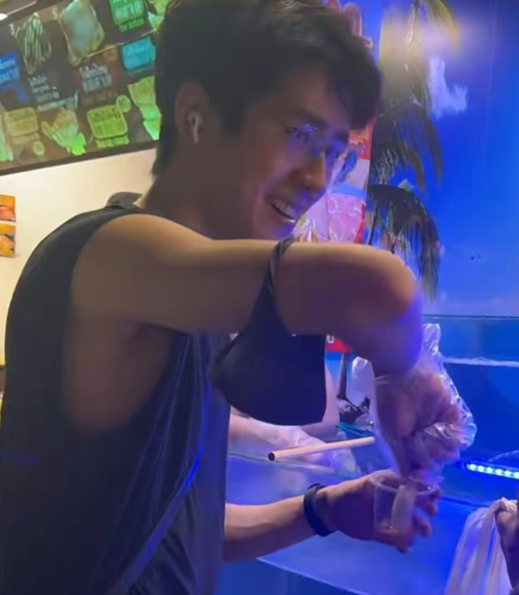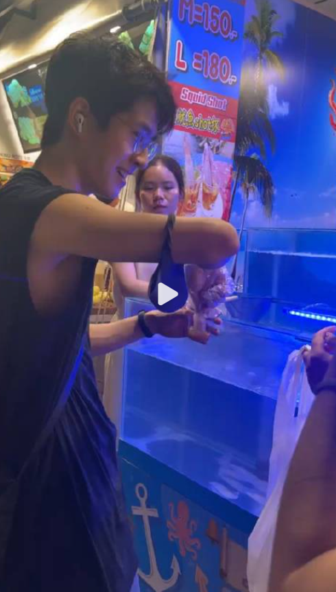 也有网友拍摄到刘昊然吃鱿鱼的画面,看他如此开心,看来一行人玩得不错。