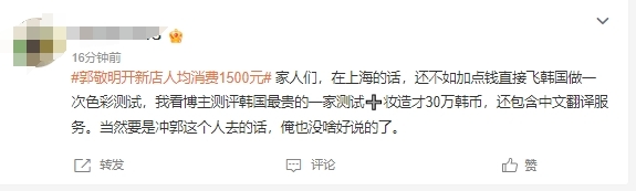 还有网友对比去韩国做色彩测试的价格,称看博主测评韩国最贵的一家做测试再加上妆造才30万韩币(约合人民币1575元)。