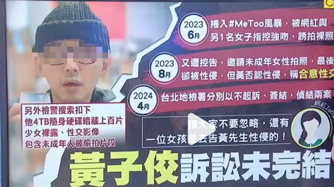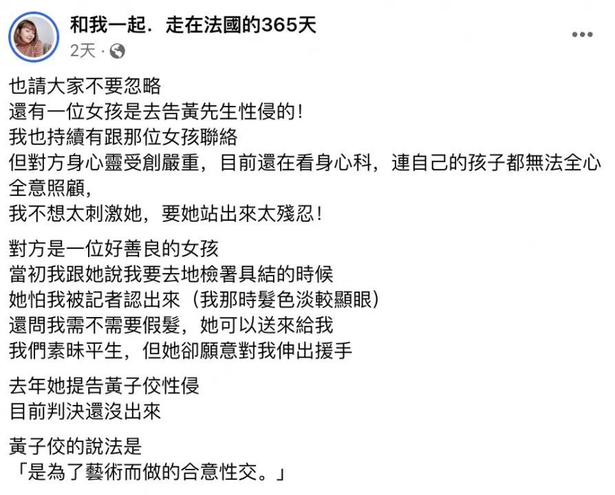 第一位站出来的Zofia(face book:和我一起.走在法國的365天)曝光,在17岁时自己遭到黄子佼的强吻,成年后又被他强行要求拍摄裸照。