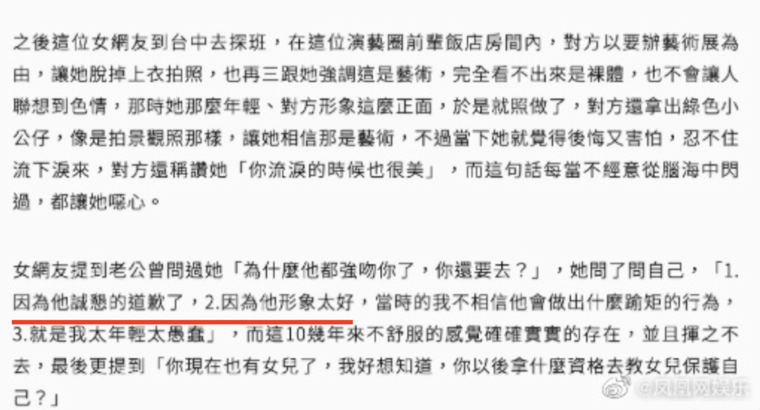 就像黄子佼几位当事女性解释自己为何照做,就是看在他“和善无害、爱妻人设、热心公益的正面形象”“当前辈一样尊敬”的份上,事后即便深受创伤也无法讲述。