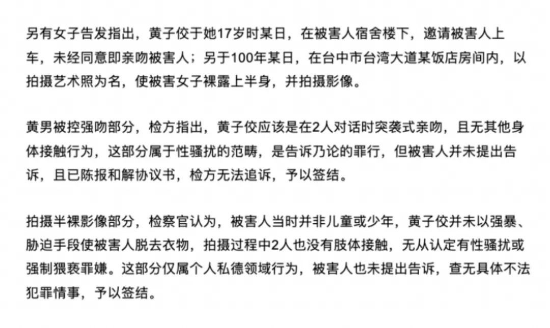 在k小姐17岁时,黄子佼以摄影为由,邀请她进行工作拍摄。最终却在私密空间里发展为拍摄裸照、强行性交。