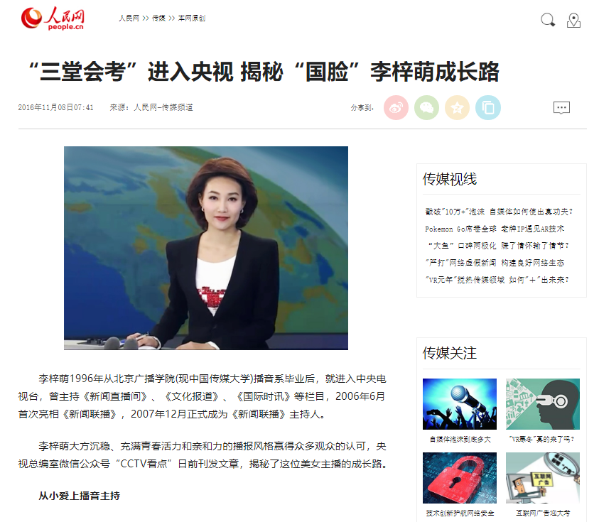 “三堂会考”进入央视 揭秘“国脸”李梓萌成长路-人民网-传媒频道-2016-11-08