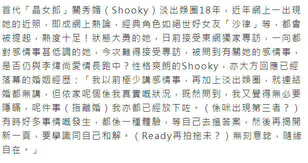 关秀媚在采访中表示以前极少讲感情事,加之淡出演艺圈,就连结婚都没有宣布,现在没必要隐瞒这件事,其实都已经放下了。对于是否有第三者?关秀媚没有否认,称发生了很多事,等待自己去寻找答案,学会和自己和解。