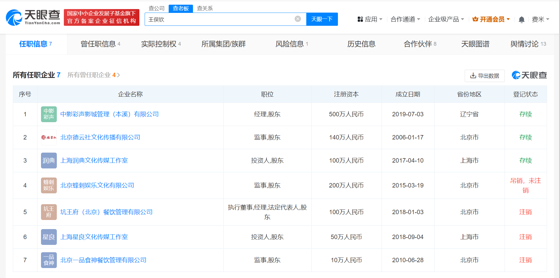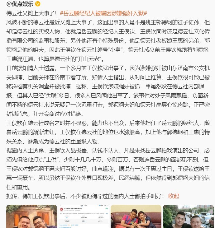 据悉,此前曾有媒体报道王俣钦因涉嫌强奸入狱。公开资料显示,王俣钦是郭德纲妻子王惠的表弟及岳云鹏经纪人。天眼查显示,目前,王俣钦名下有7家企业,其中3家为存续状态,包括其持股1%并任监事的北京德云社文化传播有限公司。