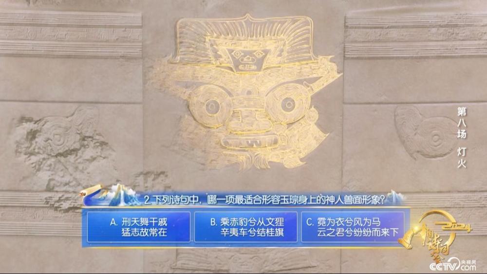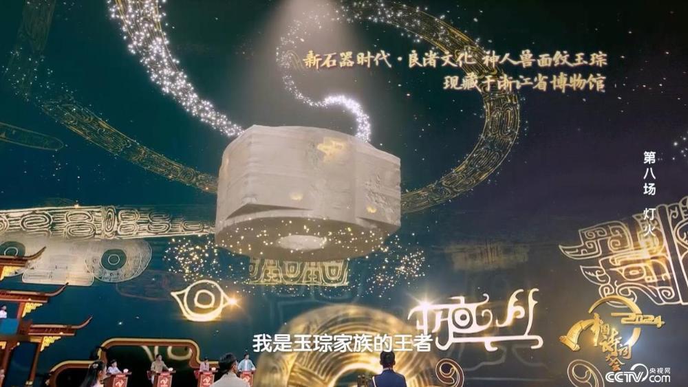 良渚文化是以磨光玉器和黑陶为代表的新石器晚期文化,是中华五千多年文明史的重要实证,在中国和世界文明进程中有着不可替代的重要地位。在良渚的考古发掘中,出土的琢制玉器,其数量之多、品种之丰富、雕琢之精美,均达到史前玉器的高峰,其中最具代表性的就是一件被誉为“玉琮王”的文物,它形体宽阔硕大,纹饰独特,四面都琢刻有完整的神人兽面纹。在本场“情景共答”环节中,节目用虚拟技术将这件“玉琮王”呈现在舞台上,并以“神人兽面纹”为题考查选手。“乘赤豹兮从文狸,辛夷车兮结桂旗”,神人兽面纹是良渚文化独一无二的标志,也体现了先民们“天人合一”的观念和信仰。