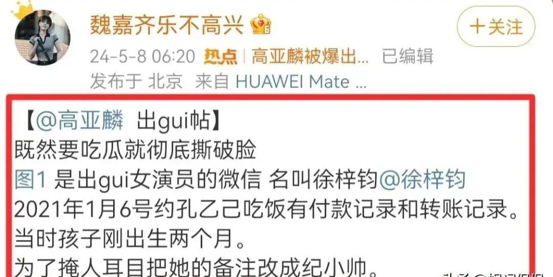 在魏嘉的眼里,高亚麟不是一个合格的男友和父亲,他在2021年约会演员徐梓钧,并且给对方转款,恰好当时,孩子刚刚出生两个月,高亚麟坐实了渣男的称号。