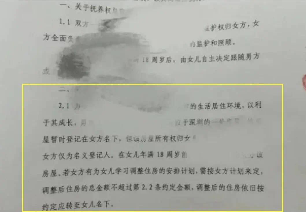 随后,魏嘉还晒出和高亚麟的分手协议,协议显示高亚麟在深圳的一处房产登记在女方名下,但房屋的所有权归孩子所有,魏嘉仅是登记人,在孩子满18岁之后要归还。