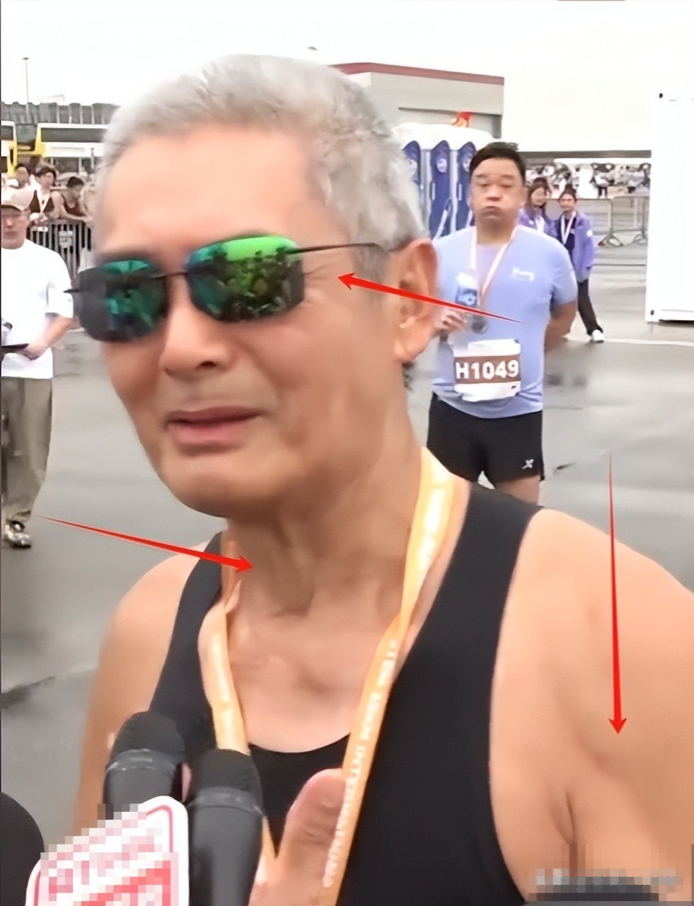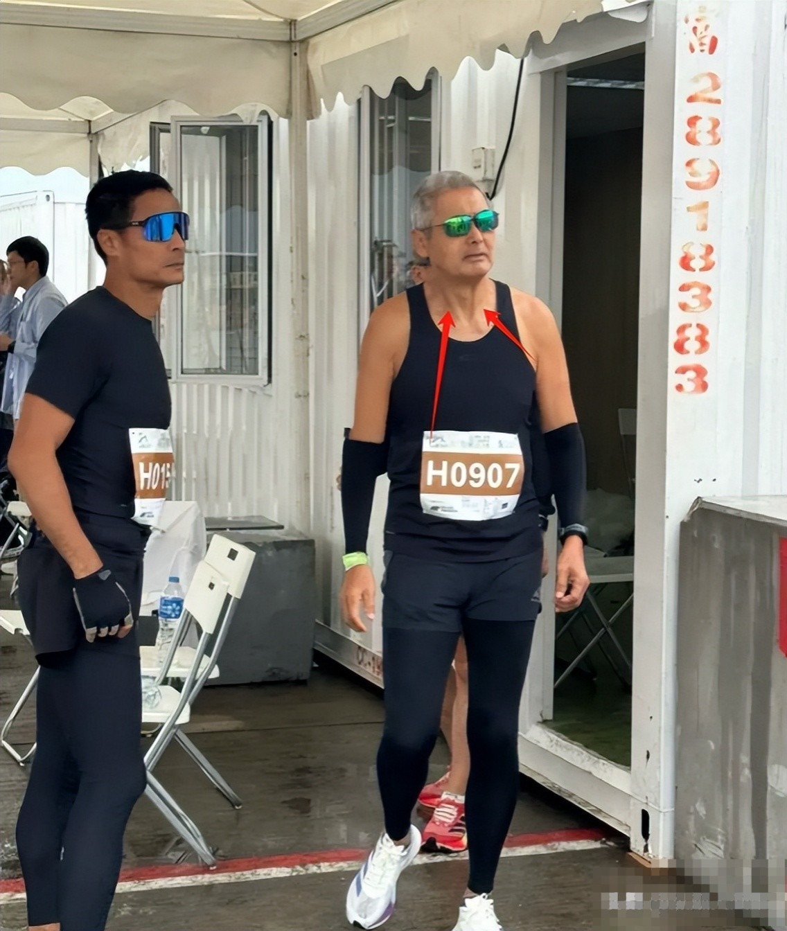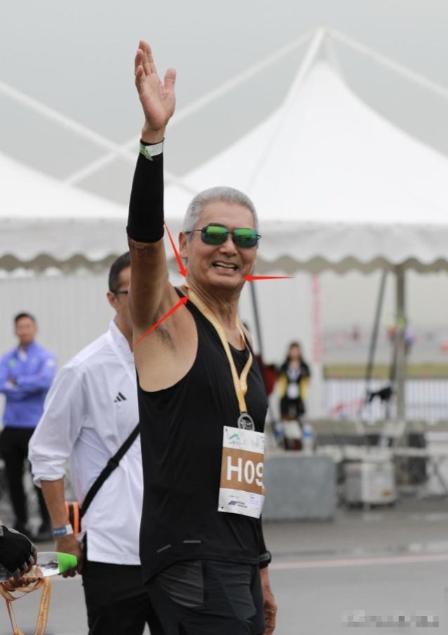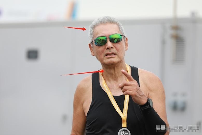 不得不说,虽然这套打扮方便跑步,但是暴露了太多他衰老的状况了。在照片中能注意到,周润发的身体和胳膊上,有两条明显的黑白分界线,而他的脖子有更加明显的老态。