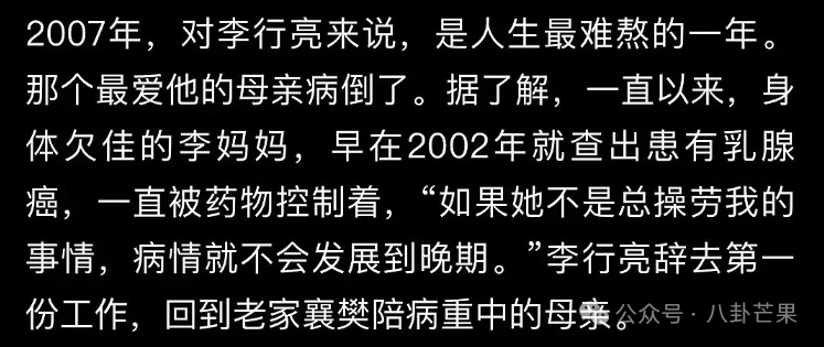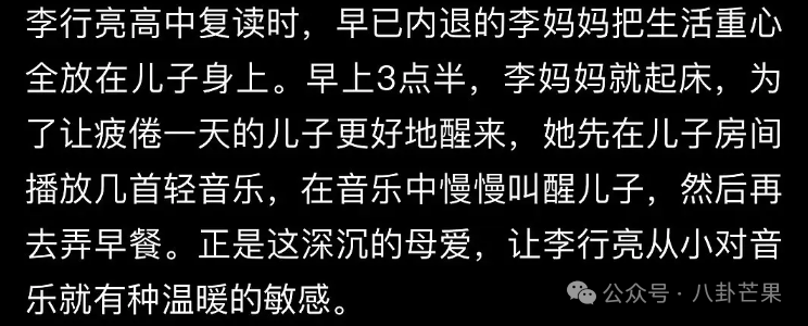 李行亮出身于湖北普通工人家庭,高中复读考上华中科技大学02级。复读时候,母亲每天凌晨三点半起床给他放音乐,做早餐。