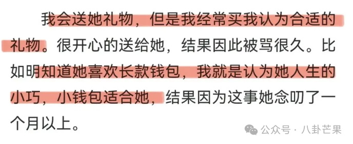 麦琳送他一个国产乐高,他不喜欢,在节目说了两次。他不说自己明知道麦琳喜欢长款钱包,偏偏送短款。