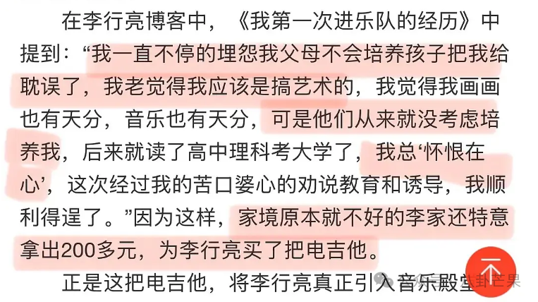 可见李行亮的父母的性格,是非常传统的伟大无私奉献型。但是李行亮曾经是这样子对父母的,很多埋怨。↓↓可以理解他想要电吉他,但是正常心态应该是看到父母的苦,挺难张口。他是反过来。