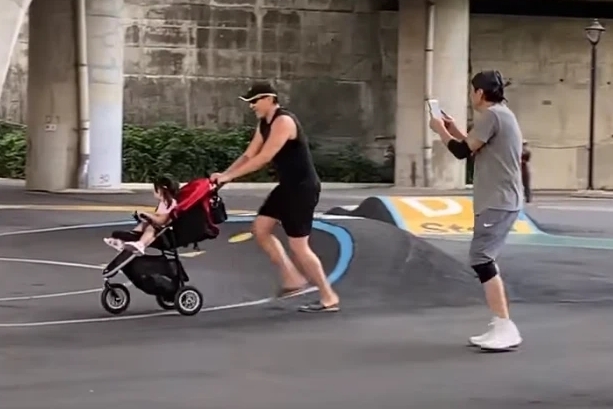 前阵子有人偶遇秦汉推着孙女出去遛弯。