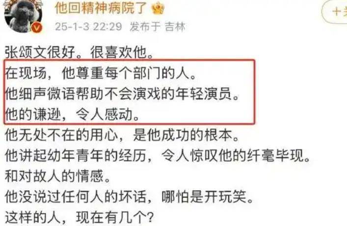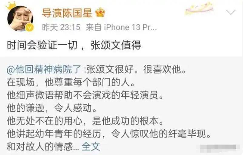 曾经和张颂文合作过的导演蔡尚君亲自发文称张颂文在剧组一直兢兢业业,对每一个合作过的演员都是一视同仁。