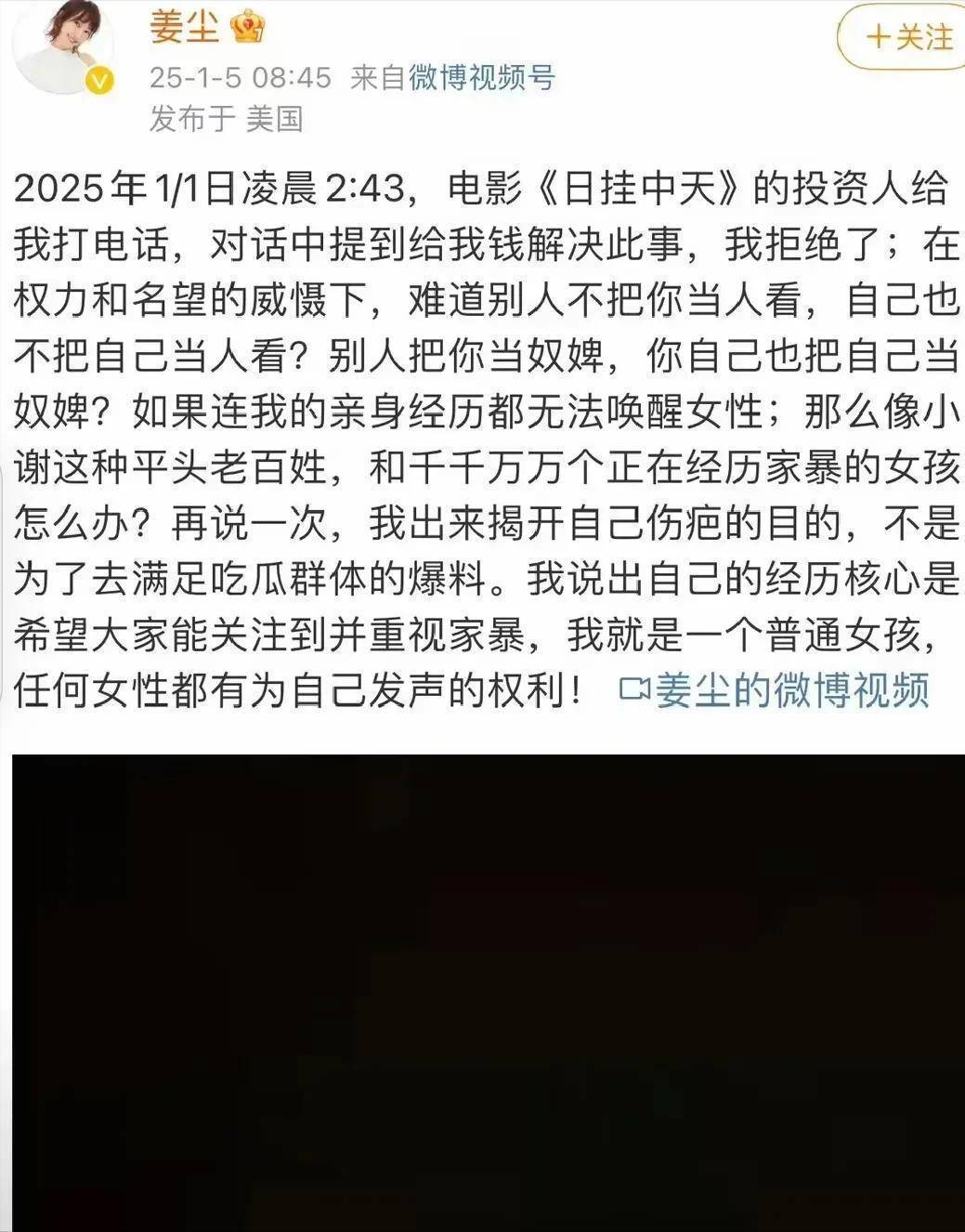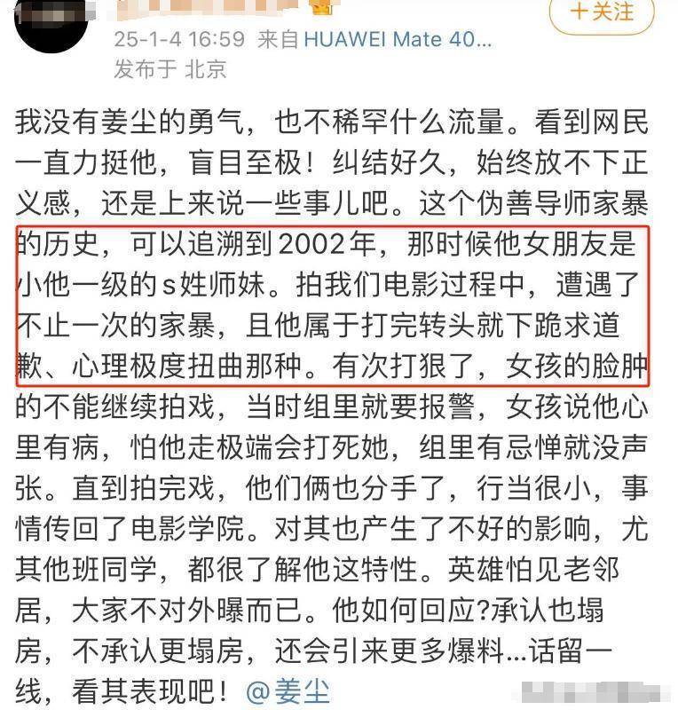 年末年初之际,演员姜尘曾连发两条视频,曝光自己曾被一位男明星的前男友家暴不忠诚,而且这位男明星还同时和多位女学生有染。