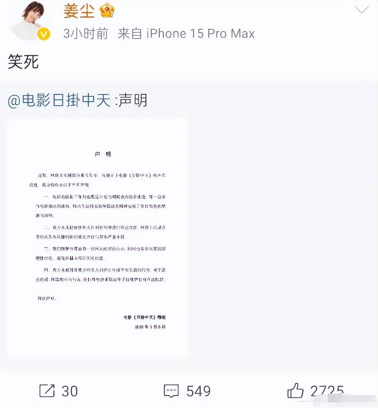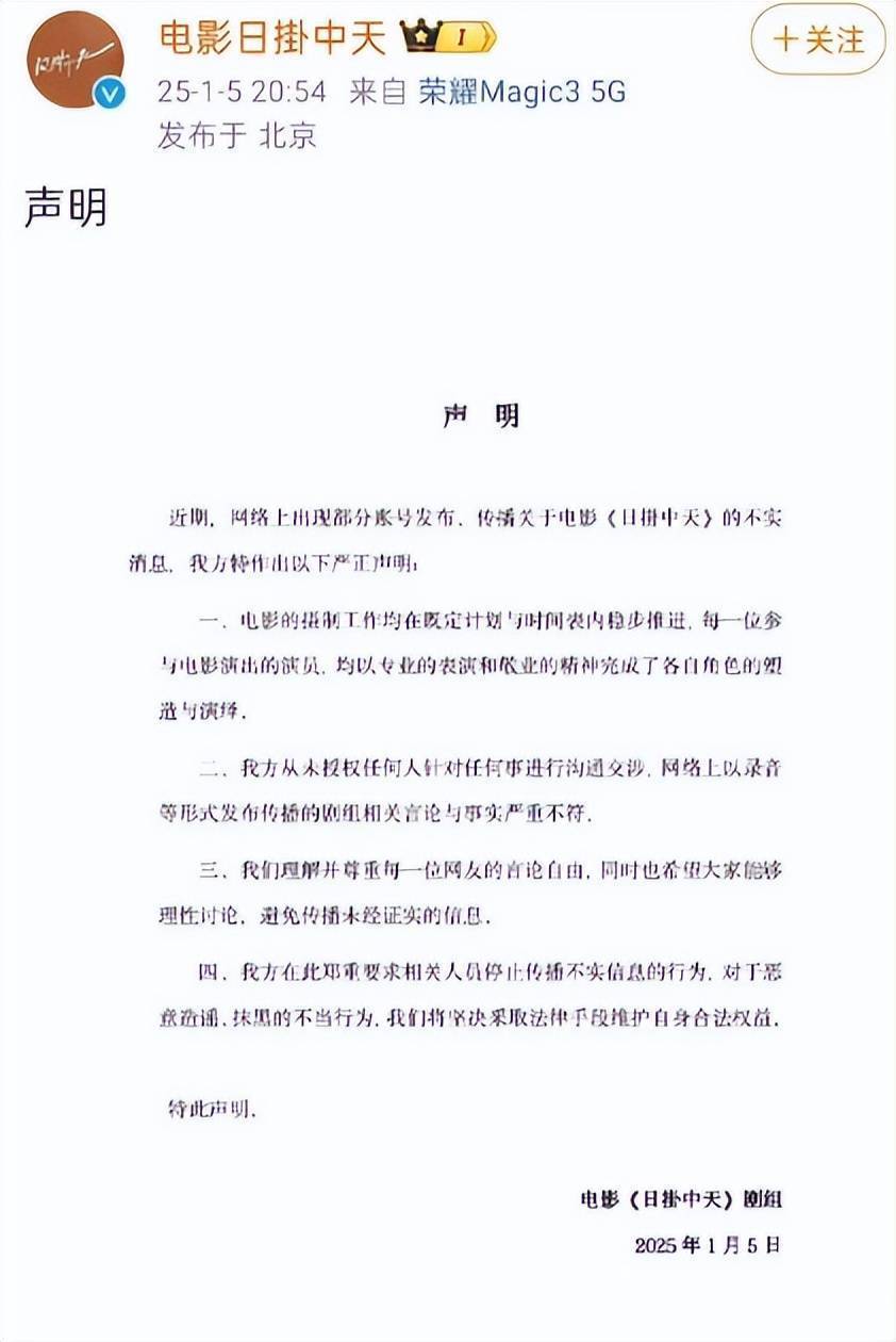 随着这件事的进一步发酵,《日掛中天》的片方发出了声明,表示从来没有授权任何一个负责人对这件事进行沟通交涉,网络上的相关录音和事实严重不符。