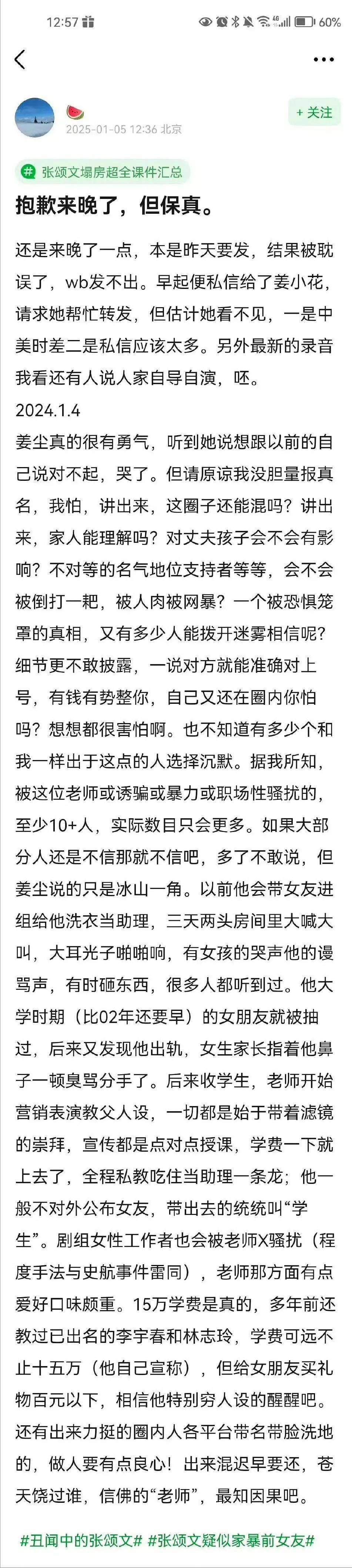 紧接着,又有第二位知情人出现曝出更多猛料,说姜尘爆出来的只是冰山一角,被张颂文家暴过、诱骗、性骚扰的女孩至少十几人,甚至有可能更多。