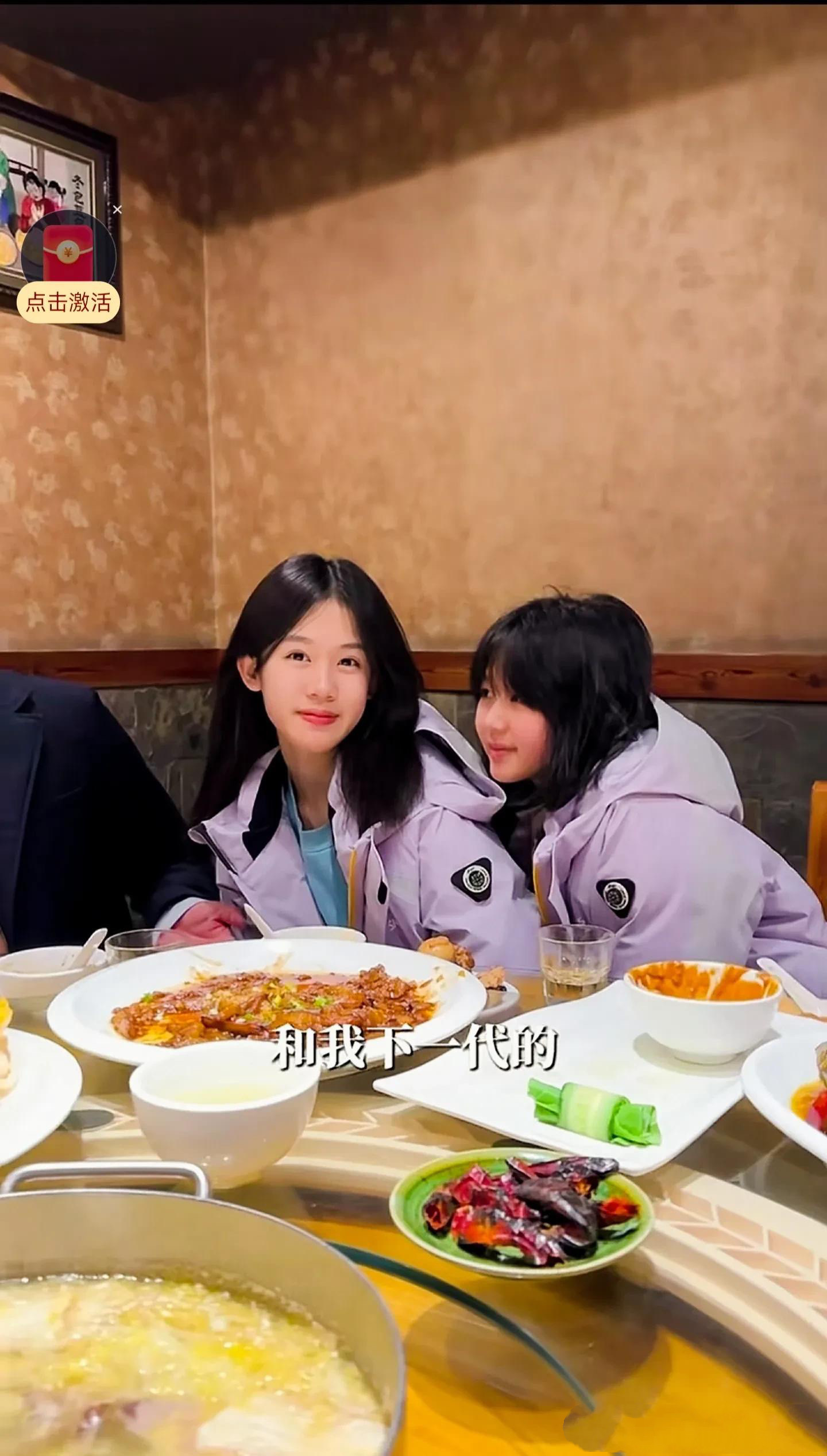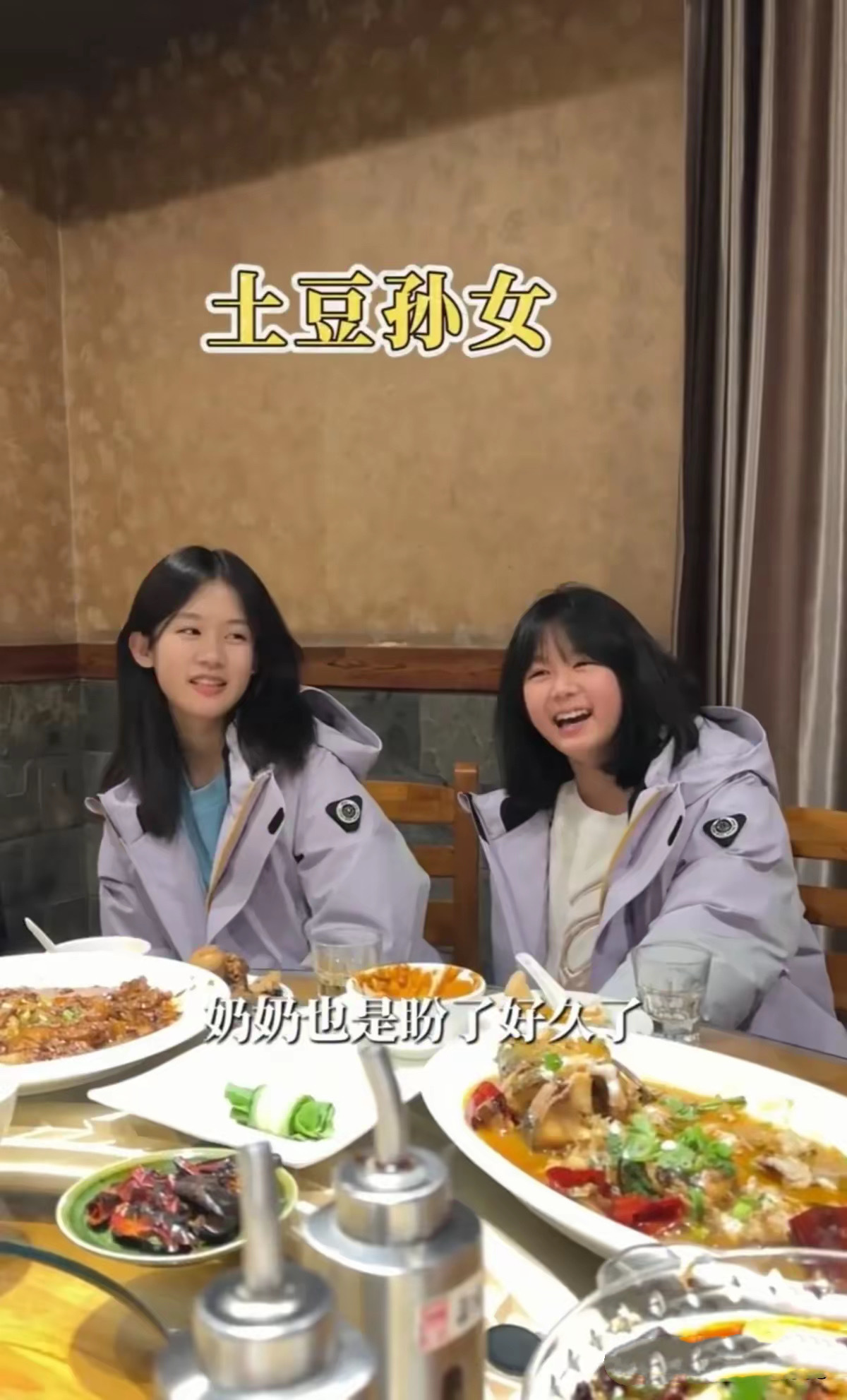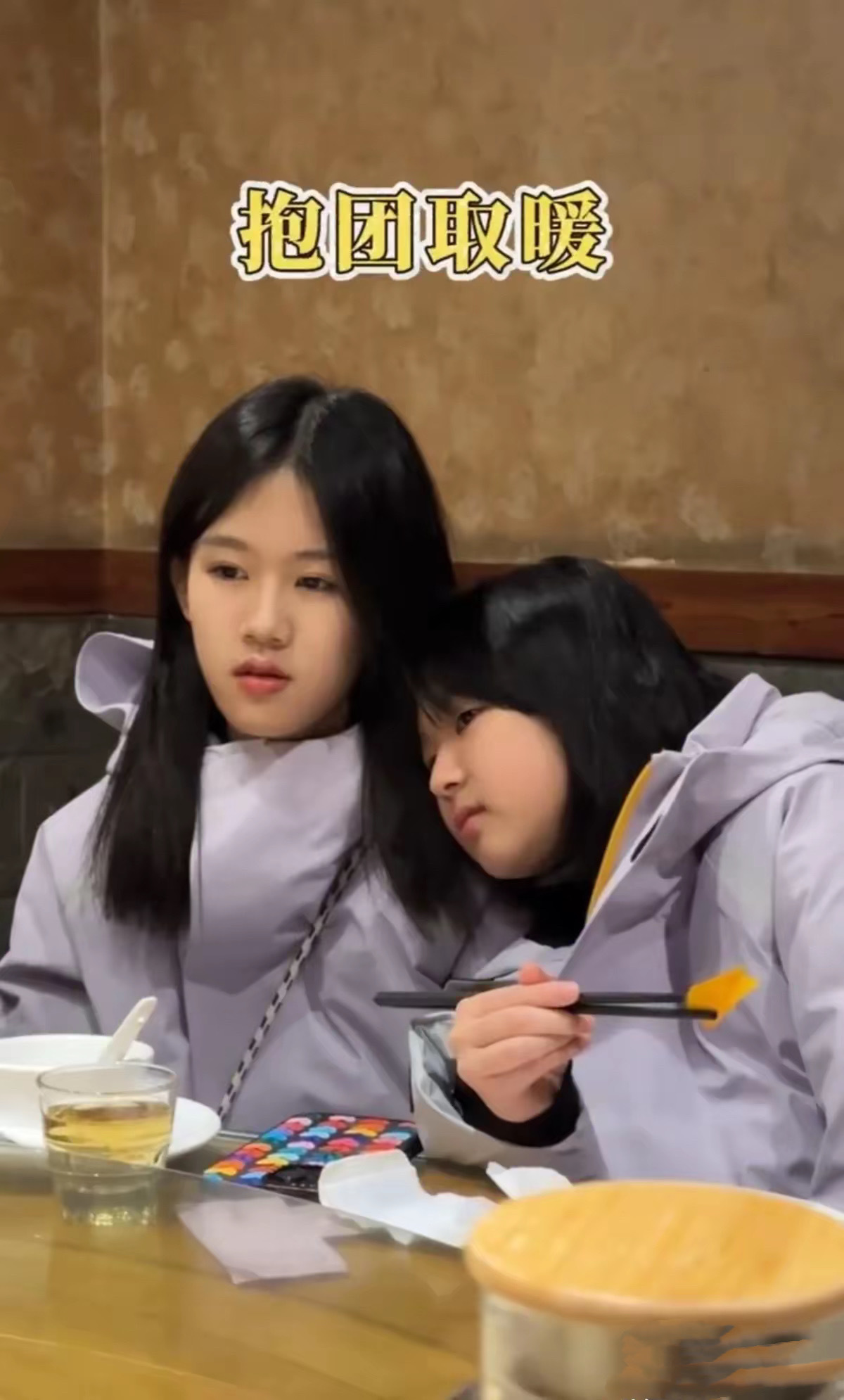听说东北的室内没有那么冷呀,尤其是吃饭的餐厅里,暖气应该烧得很足才对。也可能是小姑娘有点羞涩,抱在一起很亲昵。