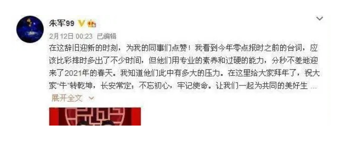 然而如果不是朱军在微博上的一篇文章,观众们根本就没有意识到2021年春晚上发生了什么?