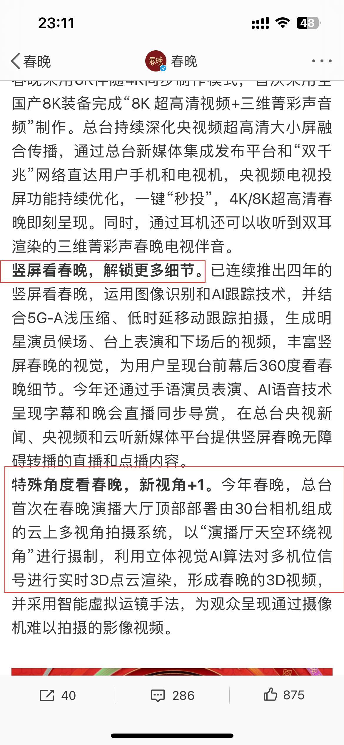 最重要的是今年春晚,总台首次在演播大厅的上方,放置了多视角拍摄系统,形成春晚的3D视频,为观众呈现摄像机难以拍摄出来的效果。