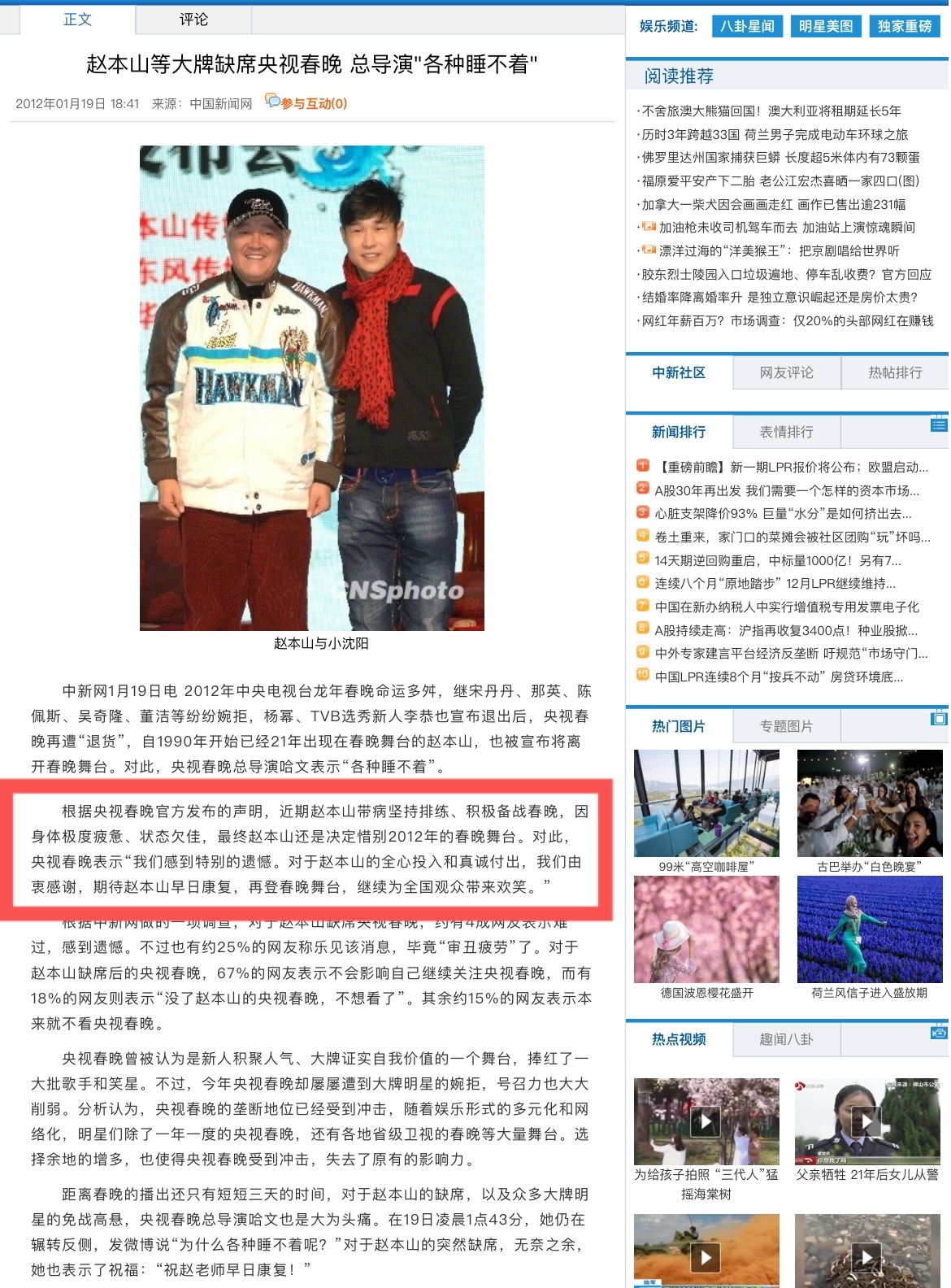 2012年春晚播出前夕,“小品王”赵本山突然宣布因身体原因选择退出,引来网友及媒体的广泛关注。