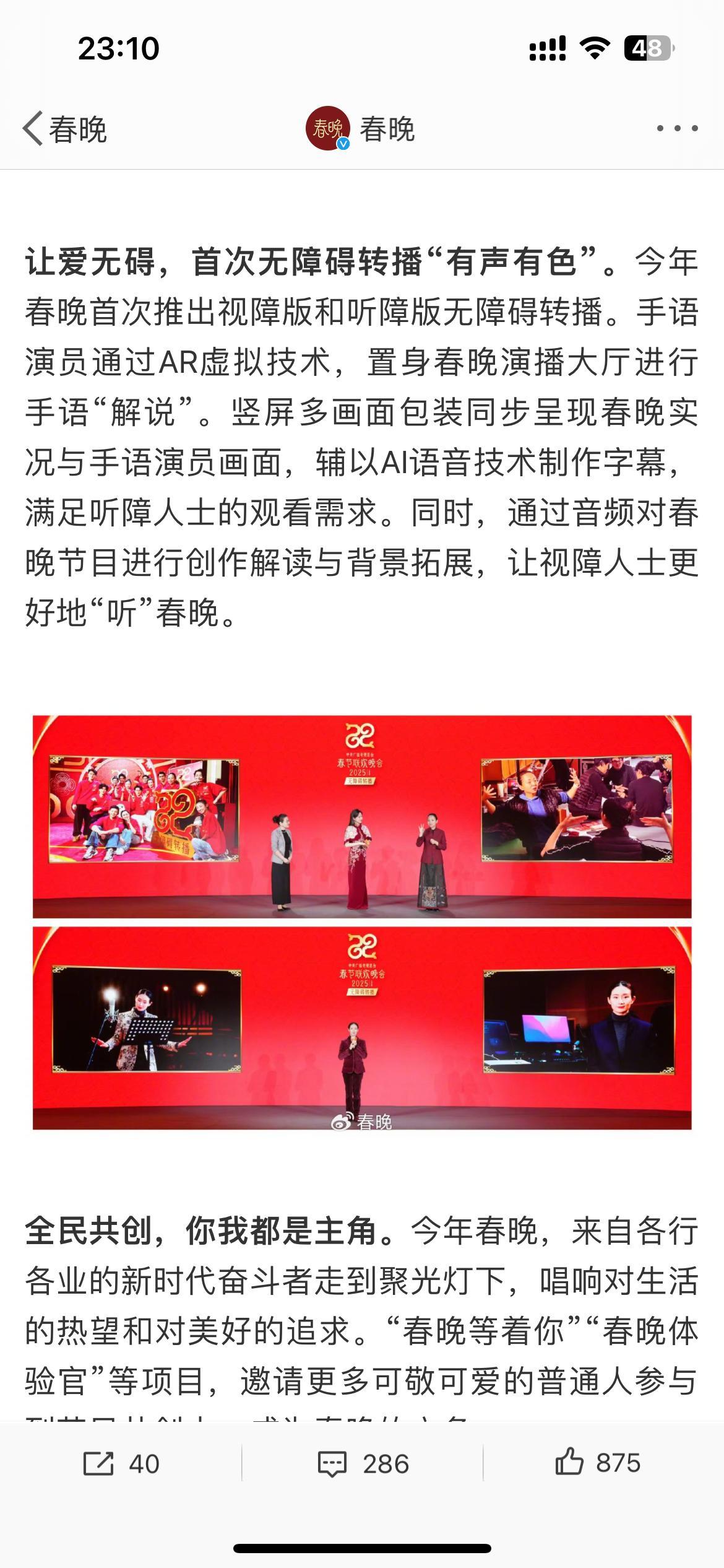 首次在今年推出无障碍转播,并且还有全民共创,开展了诸如“春晚等着你”等特殊项目。
