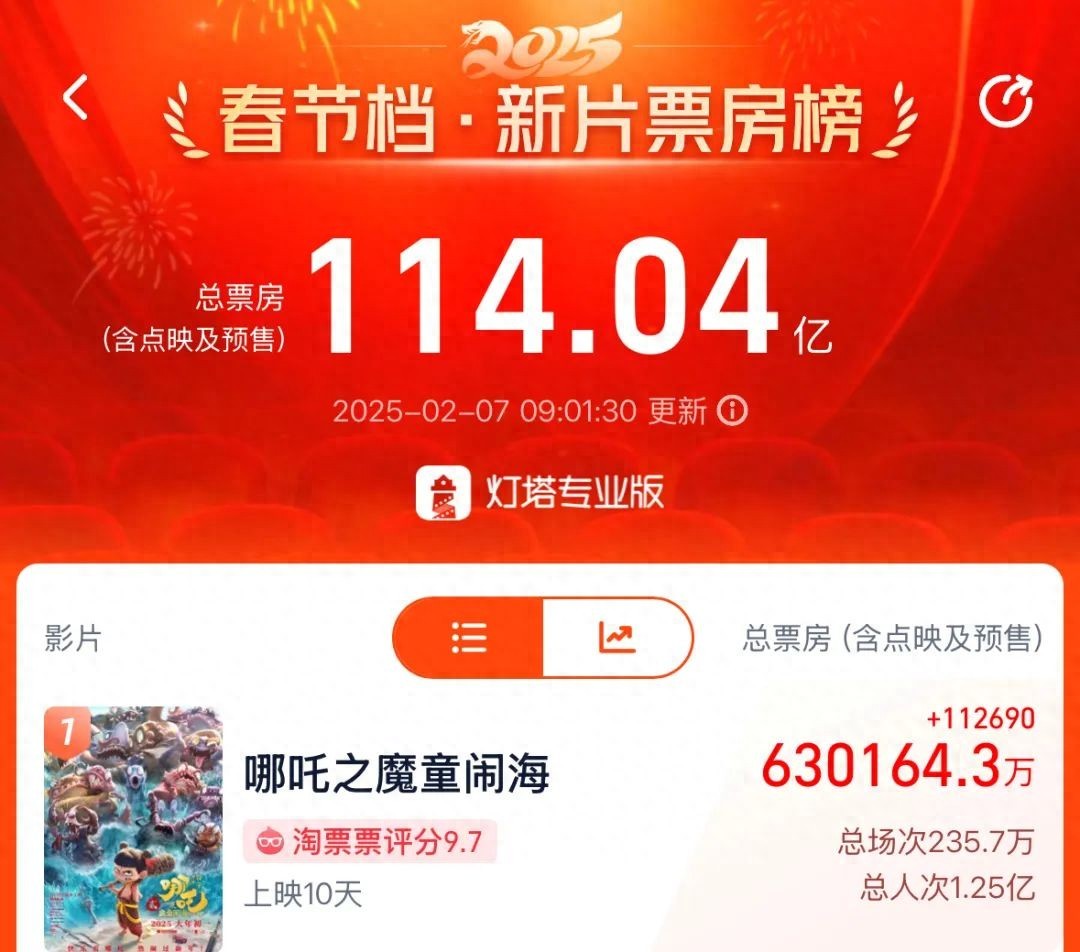 2月6日中午,电影《哪吒之魔童闹海》票房超过《长津湖》,登顶中国影史票房榜。截至2月7日上午9时许,据灯塔专业版,总票房已达到63亿(含预售)。
