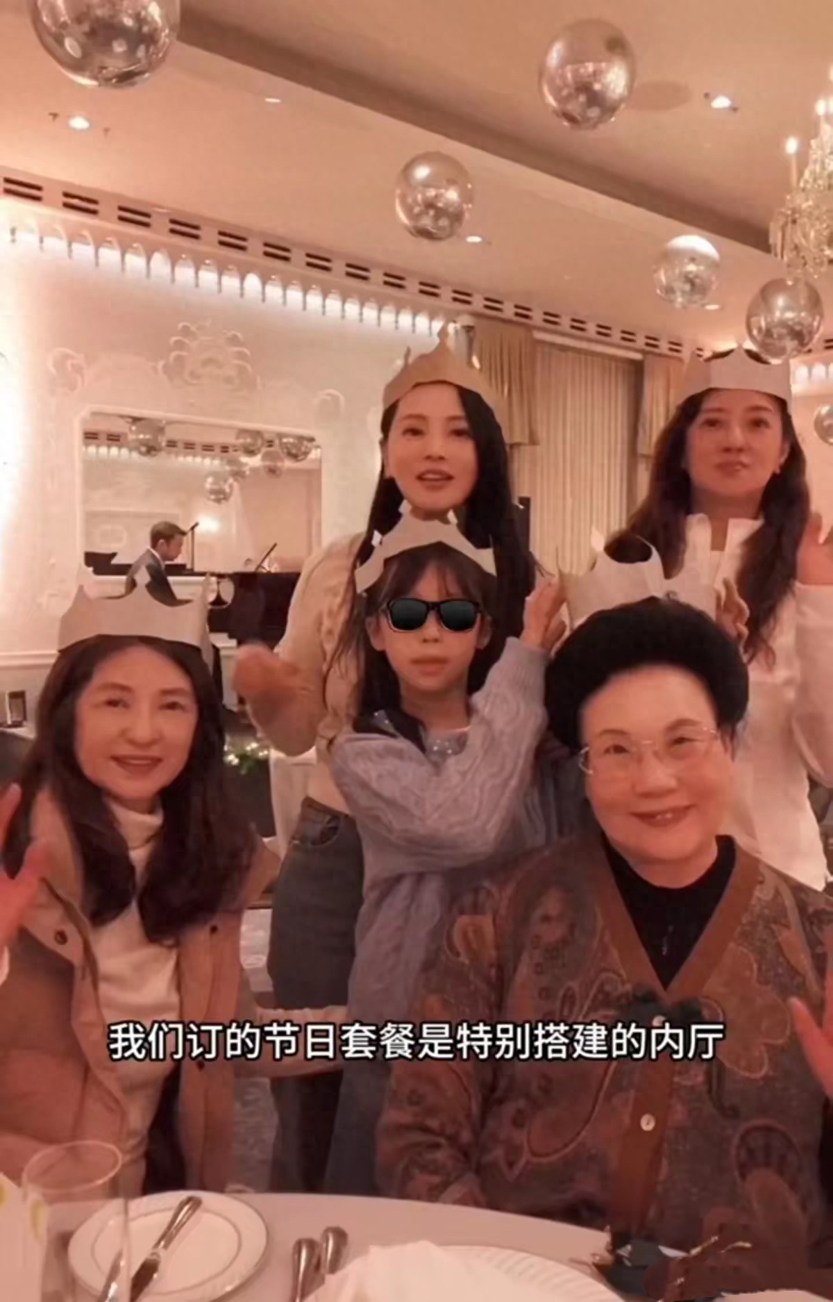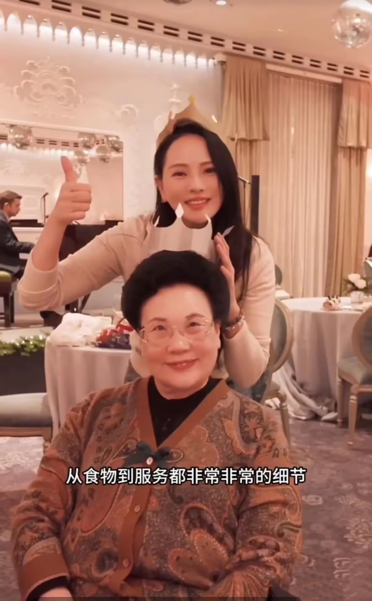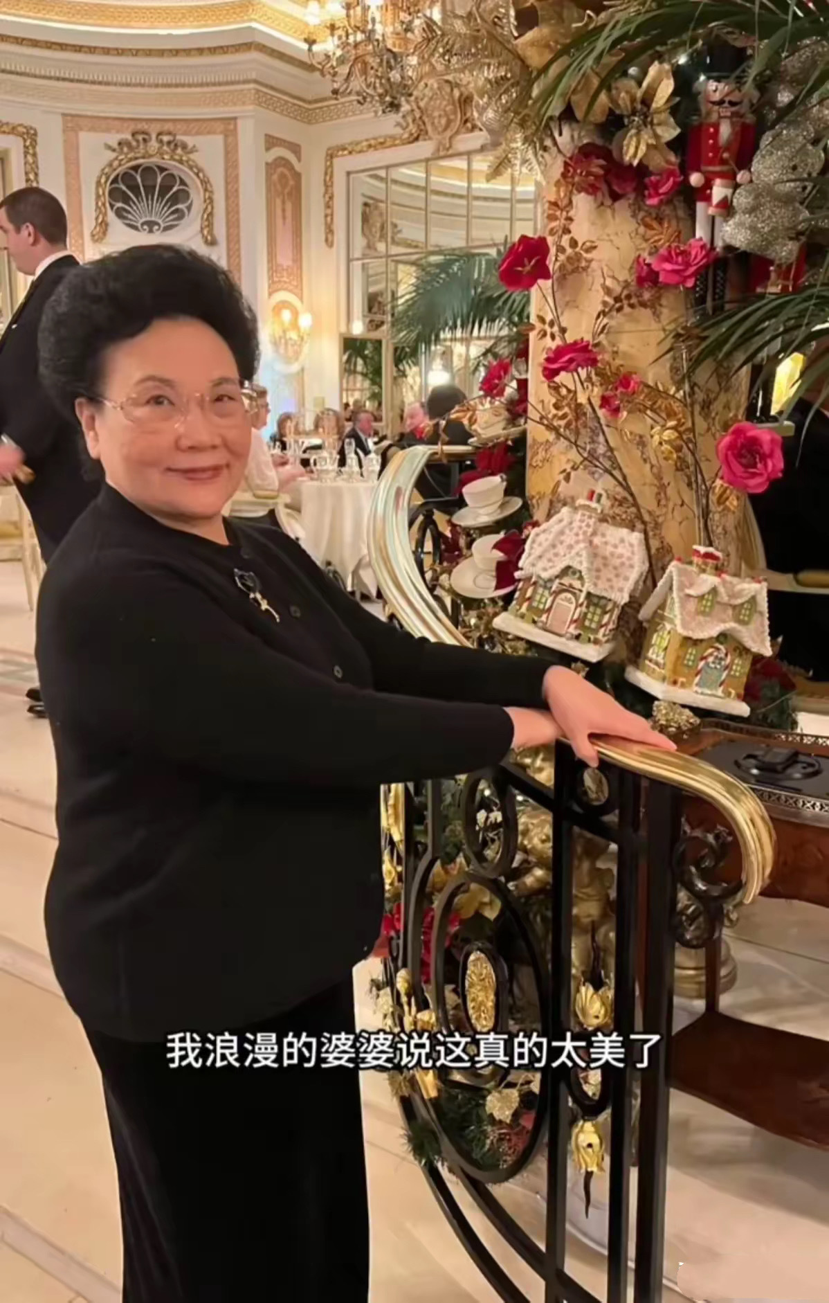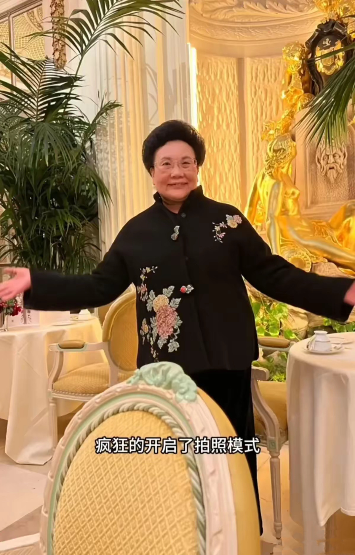 伊能静婆婆穿了一件新中式的外套,丝绒面料、刺绣印花的点缀,简单高级格外显贵。在华丽的背景下,婆婆不停的拍照。