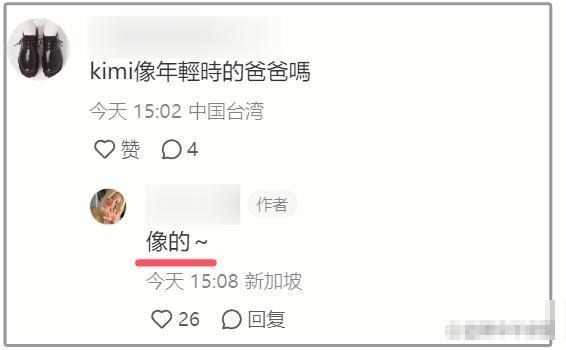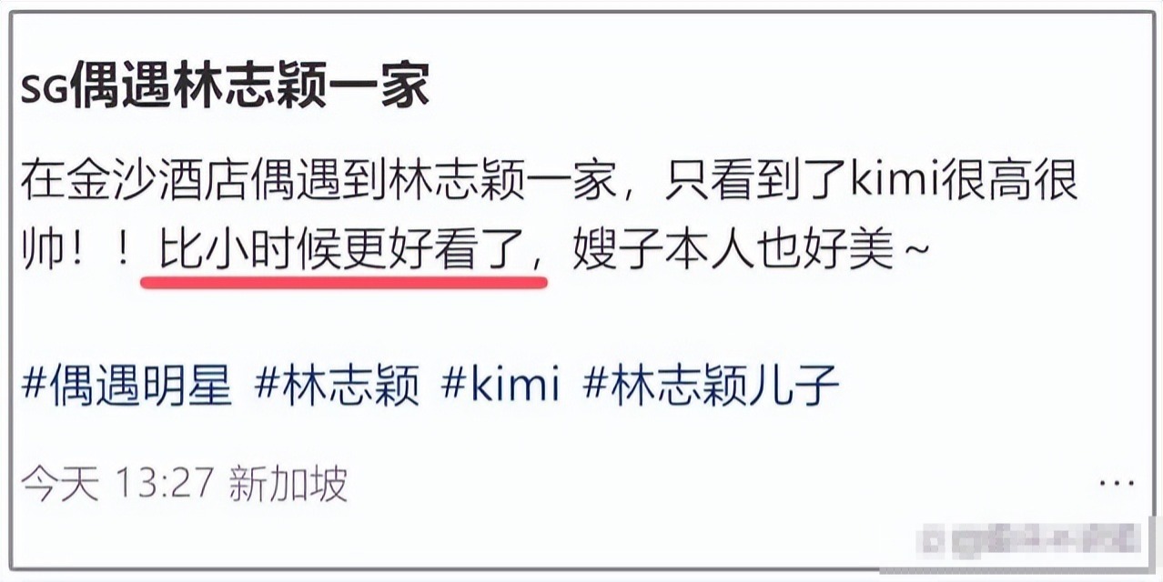 不过,这次在新加坡的偶遇,Kimi 用自己帅气的形象有力地反击了外界的质疑。多位偶遇者都对 Kimi 的帅气赞不绝口,纷纷表示他长得像年轻时的林志颖。其实,早在去年 12 月,Kimi 和父母一同去看周杰伦演唱会时,就被拍到了帅气的模样。当天,他们一家三口坐在观众席上,Kimi 虽然戴着口罩,但从露出的眉眼依然能看出,他已经长成了一位大帅哥。尤其是他的那双眼睛,明亮有神,笑起来弯弯的,与 17 岁时的林志颖如出一辙。