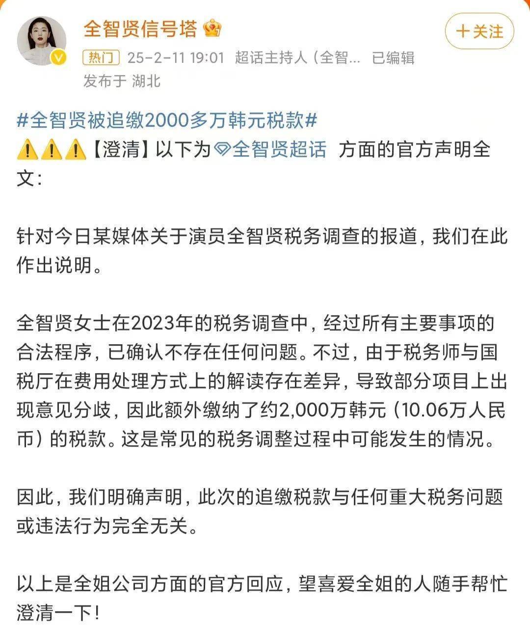 在2023年9月,全智贤接受了国税厅的高强度税务调查,其财务状况被详细审查,经过一系列的程序和审查,国税厅最终决定追缴其约2000万韩元的税款。
