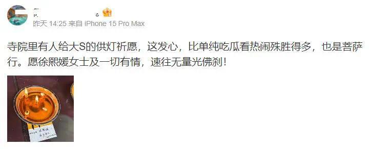 寺庙里特意为大S点灯,这一种善心,比单纯吃瓜看热闹的殊胜太多太多,也是菩萨行。愿徐熙媛女士及一切有情,速安!