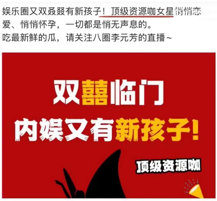 2月13日,有八卦媒体在网上曝出预告,称娱乐圈又有新孩子,顶级资源咖女星悄悄恋爱、悄悄怀孕,一切都是悄无声息的。