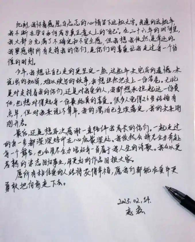 公布喜讯之后,赵磊怀揣着感激和紧张,用笔尖倾诉了自己的心路历程。这二十六年,充满了未知和焦虑,但他觉得自己还是挺幸运的。对粉丝们,他感激不尽,直言是大家的支持,陪伴他度过了许多迷茫的时刻。今年,他决定更加坚定地走下去,想要对那些未了的遗憾、未吐露的秘密和无法继续的故事,给出一个坦率的回应。