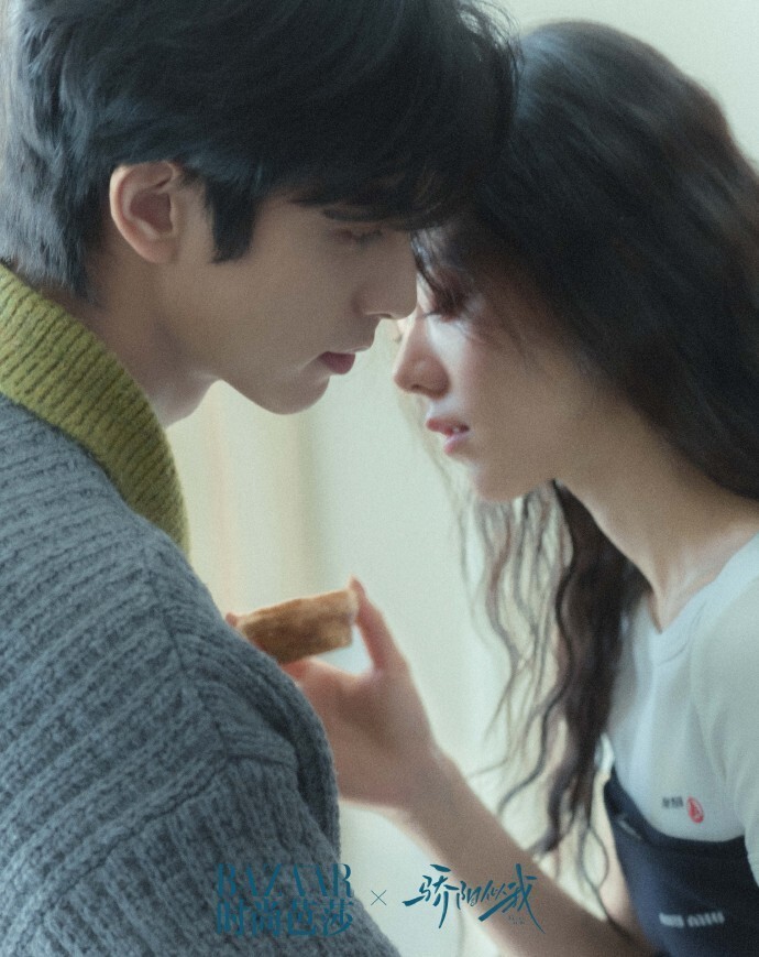 宋威龙和赵今麦的眼神低垂,看向中间位置,目光交汇,传递出一种脉脉含情、沉浸在二人世界的甜蜜氛围。他们两人的距离特别的近,将浪漫的爱情氛围渲染得淋漓尽致。赵今麦手中拿着一块食物,动作自然,似乎正要喂食或与宋威龙分享。