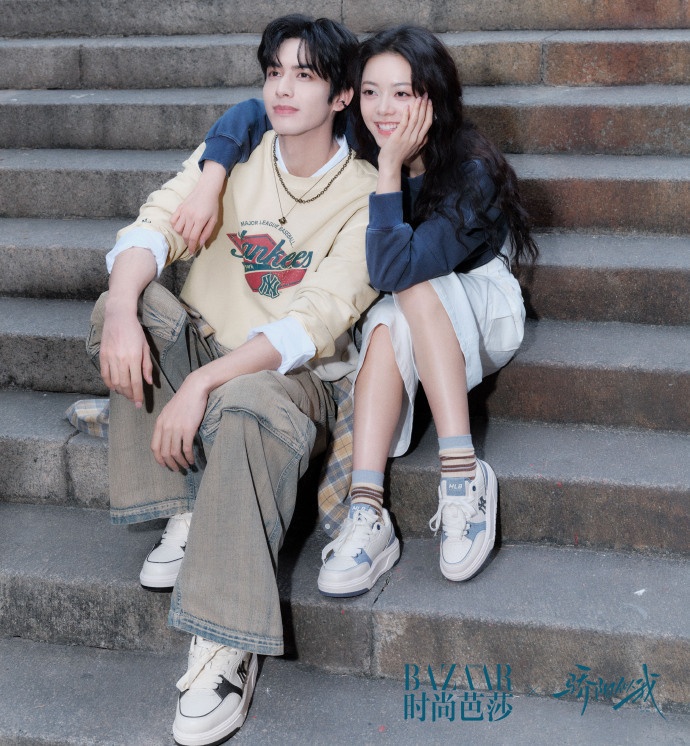 赵今麦身着深蓝色的长袖上衣,搭配白色的裙子,整体造型青春时尚。宋威龙穿着一件米黄色的印花卫衣,搭配浅棕色的阔腿牛仔裤。他们坐在石阶上,姿态放松自然。赵今麦将头靠在宋威龙的肩膀上,右手托腮,脸上带着甜美的笑容,眼神温柔。宋威龙则将手臂搭在赵今麦身后,左手自然放在腿上,面带微笑,看向镜头方向。他们的肢体语言亲密无间,传递出一种甜蜜、温馨的情感,仿佛沉浸在美好的恋爱氛围中。