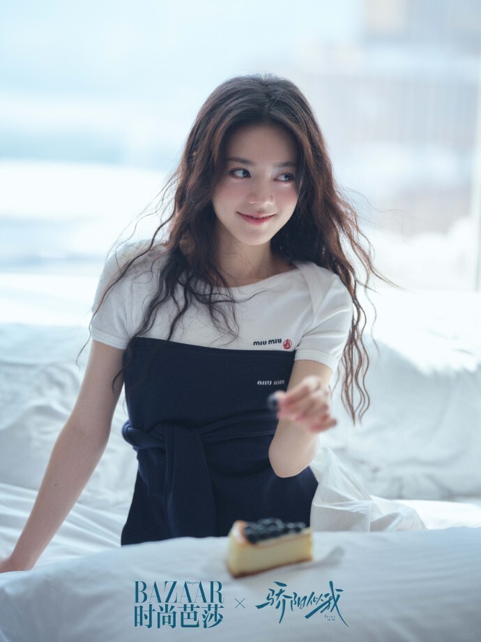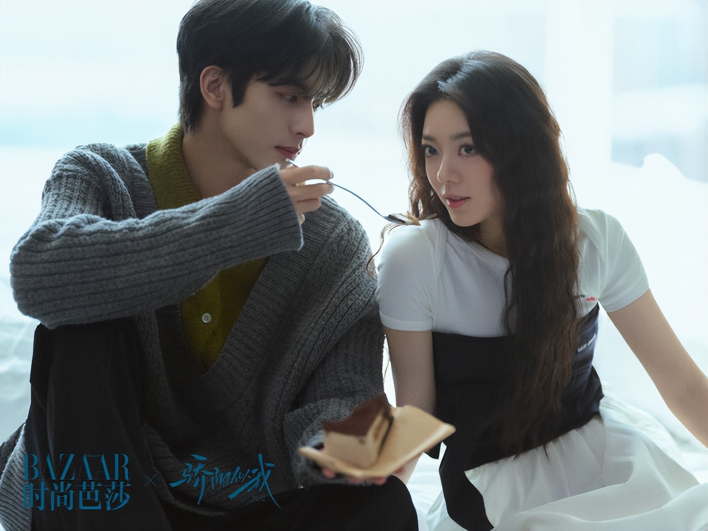 画面中的宋威龙身着一件灰色针织开衫,内搭黄绿色的衬衫,整体搭配简约而不失时尚感,赵今麦则是穿着一件白色短袖上衣搭配黑白拼接的裙子,尽显时尚与俏皮。宋威龙手持一块蛋糕,用叉子挑起一小块,动作自然,眼神专注地看向赵今麦,似乎正准备喂给她。赵今麦身体微微向宋威龙倾斜,眼神中带着一丝温柔与期待,看向他手中的蛋糕,两人的姿态和眼神互动,传递出一种亲密、甜蜜的情感,仿佛沉浸在二人世界的温馨氛围中。